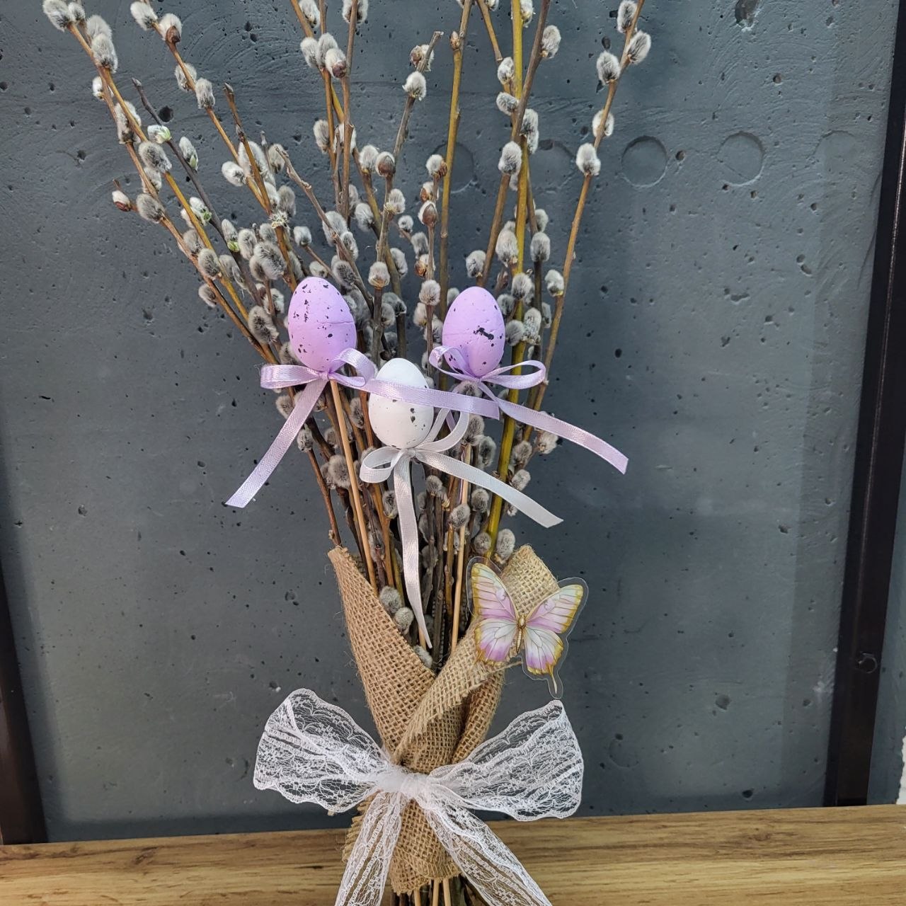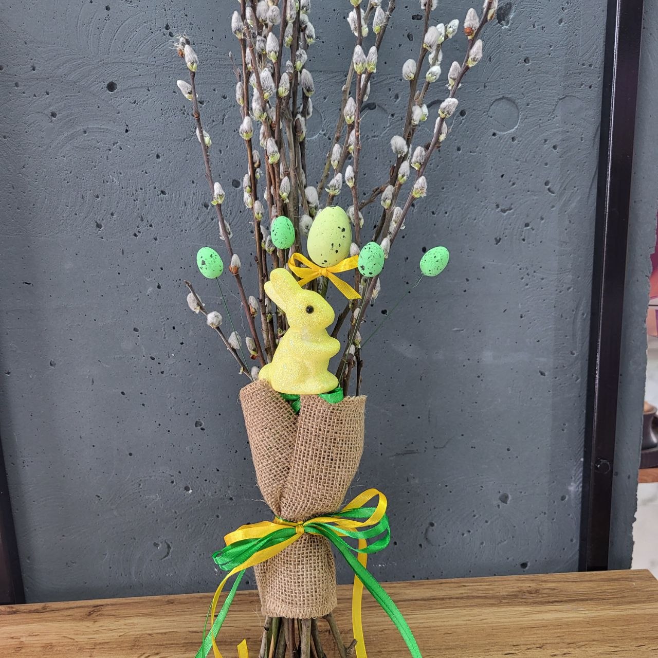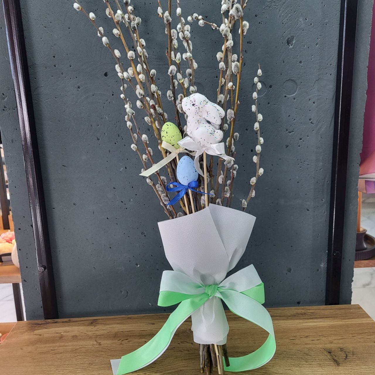 Букетик з верби з декором. Букетик з вербових гілочок (котики) з декоративними яєчками та зайчиками. Чудовий декор для Великодніх свят, на Верну неділю. Висота: 55-60см.