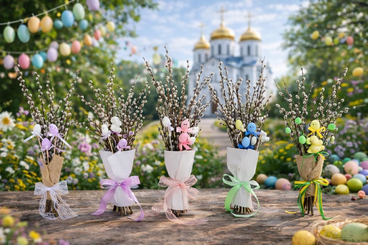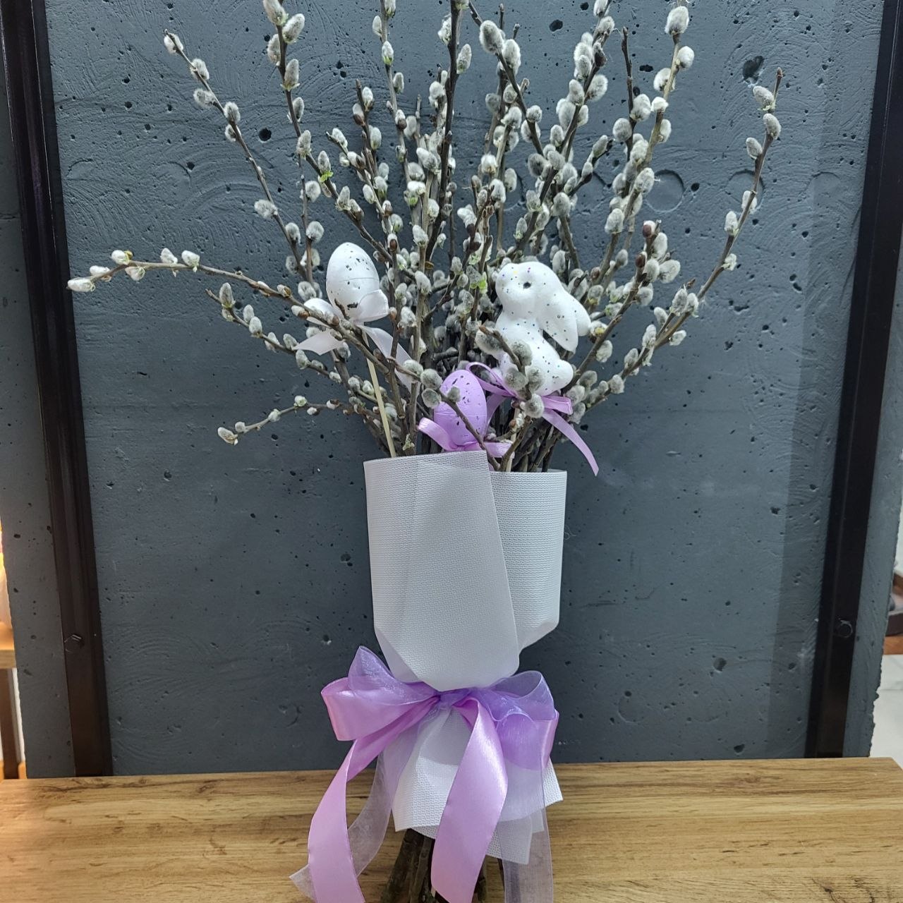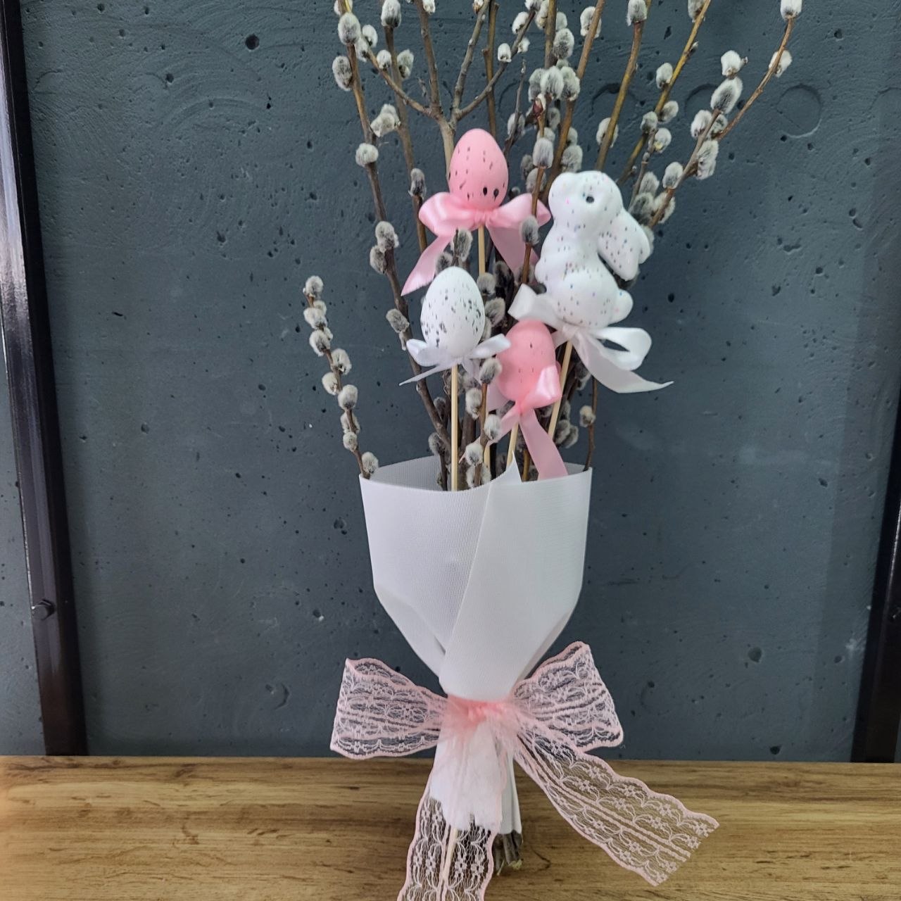 Букетик з верби з декором. Букетик з вербових гілочок (котики) з декоративними яєчками та зайчиками. Чудовий декор для Великодніх свят, на Верну неділю. Висота: 55-60см.