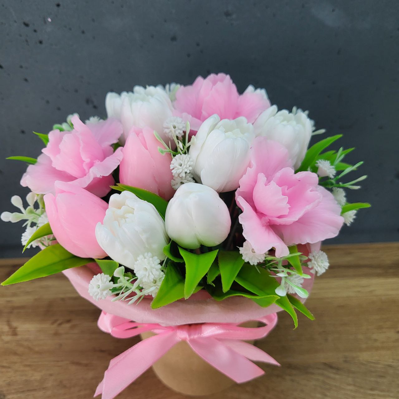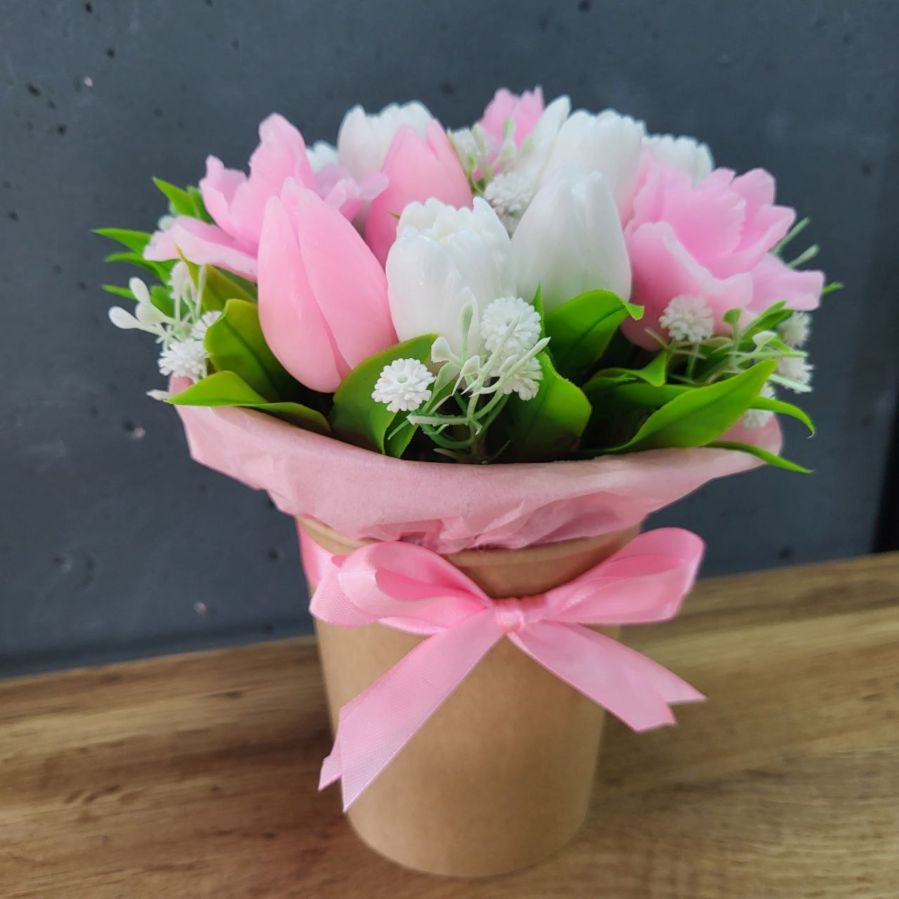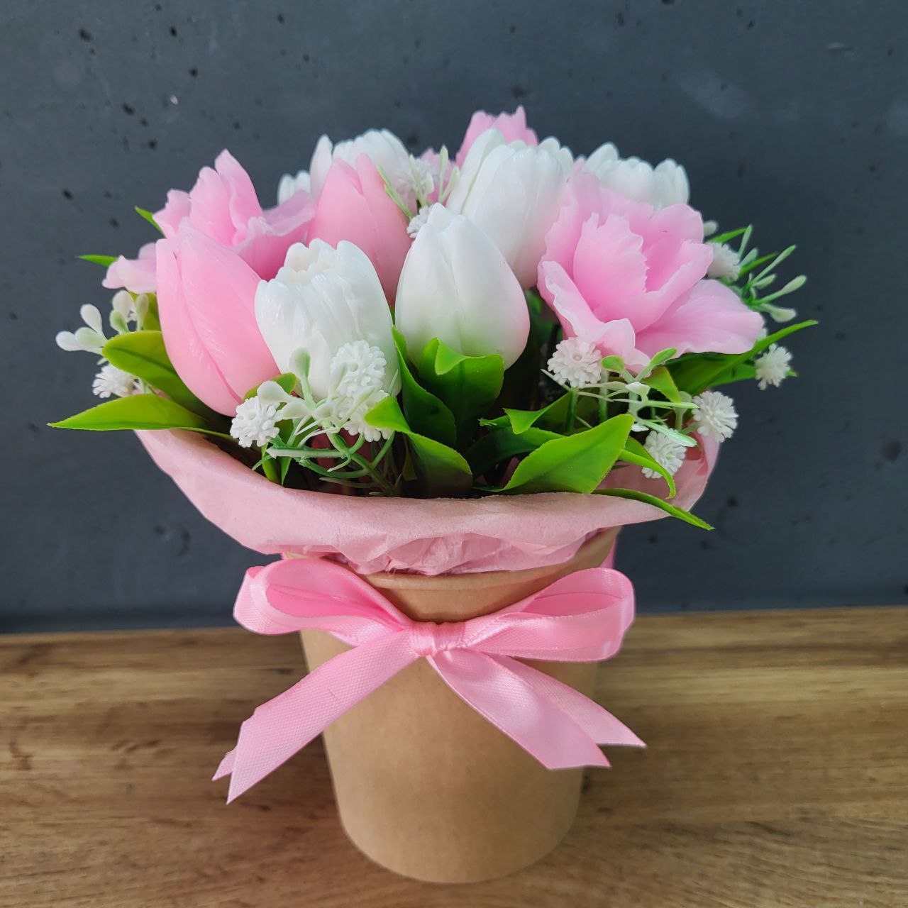 Букет тюльпанів в стакані. Колір біло-рожевий. Розмір виробу: 20х15см. Виріб з мила з легким приємним ароматом ручної роботи. Ідеальний подарунок мамі, дружині, жінці, колезі, дівчині. Чудовий подарунок до свят – день мами, 8 березня, день народження, як знак уваги