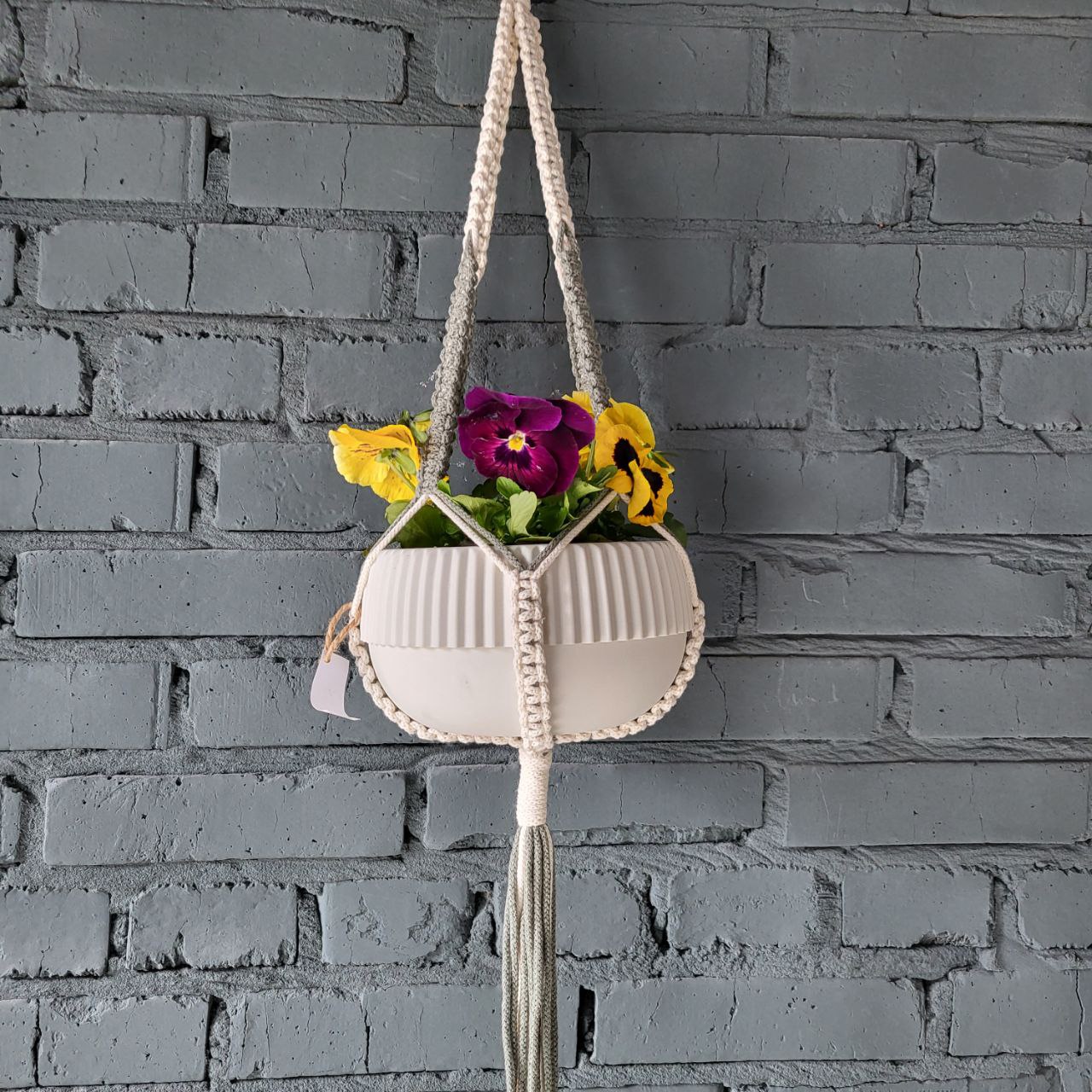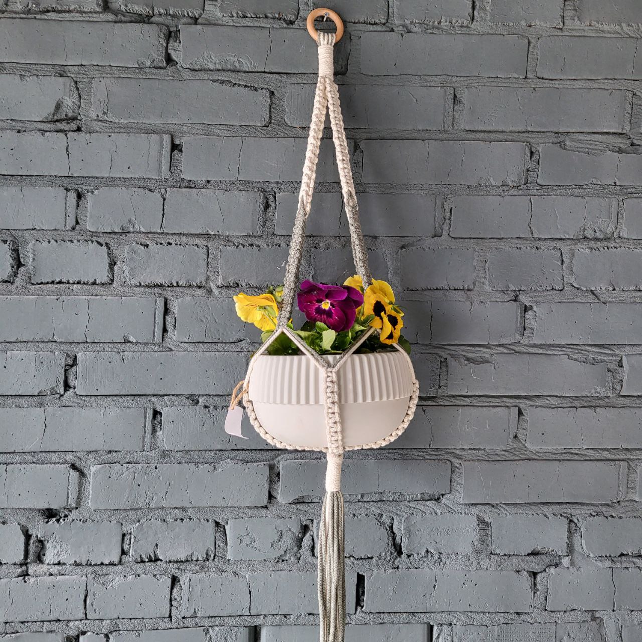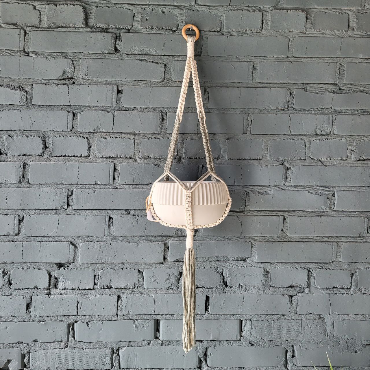 Вінтажна мотузкова корзина з декором. Колір: біло- зелений. Довжина: 100см. Кошик для квітів ручної роботи – це декоративне сітчасте кашпо. Виготовлене воно із бавовняного міцного шнура. Вони зіткані простим, але вишуканим дизайном. Ручна робота. Сітчастий кошик у богемному стилі стане ідеальним акцентом в інтер’єрі вашої вітальні, спальні або балкона. Вона також підходить для озеленення офісів, готелів, кафе і т.д. Наш кошик простий і легкий у використанні. Адже його можна підвісити будь-де. Не тільки на гачок на стелю або на стіну як підвіску, але й просто на карниз, на шафу або ще десь. В’язаний підвісний кошик для квітів підходить і для круглих, і для квадратних або фігурних горщиків. Довжина: 100см