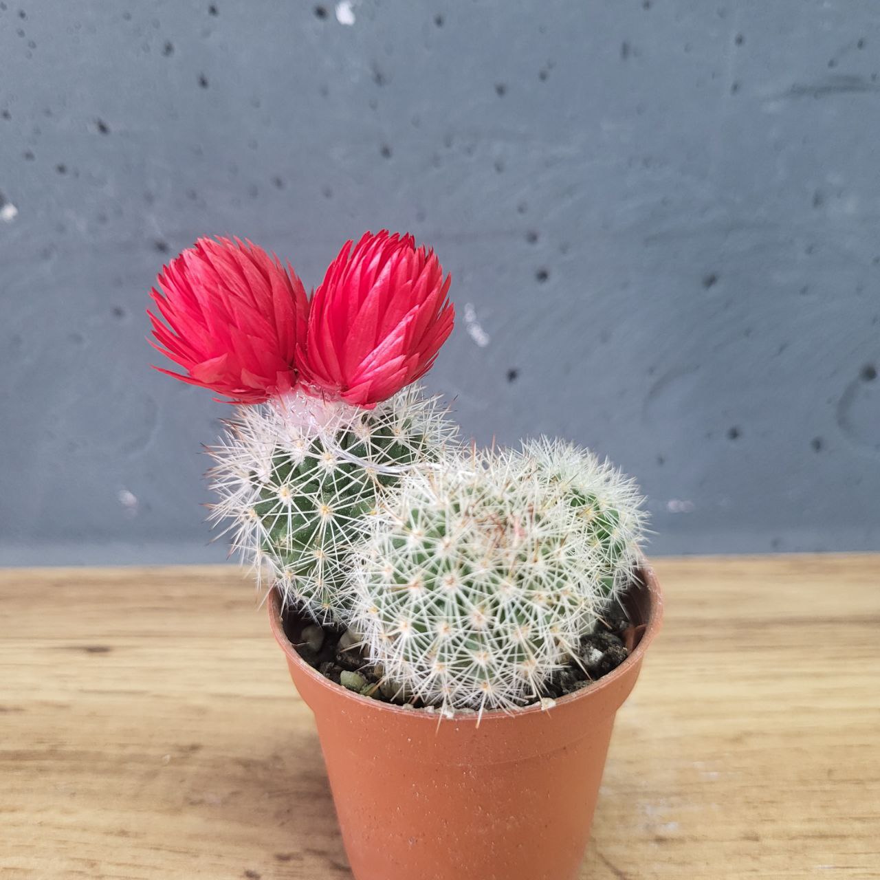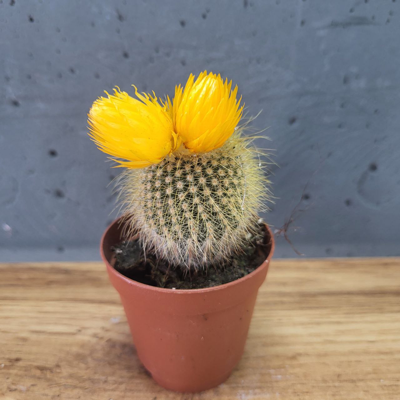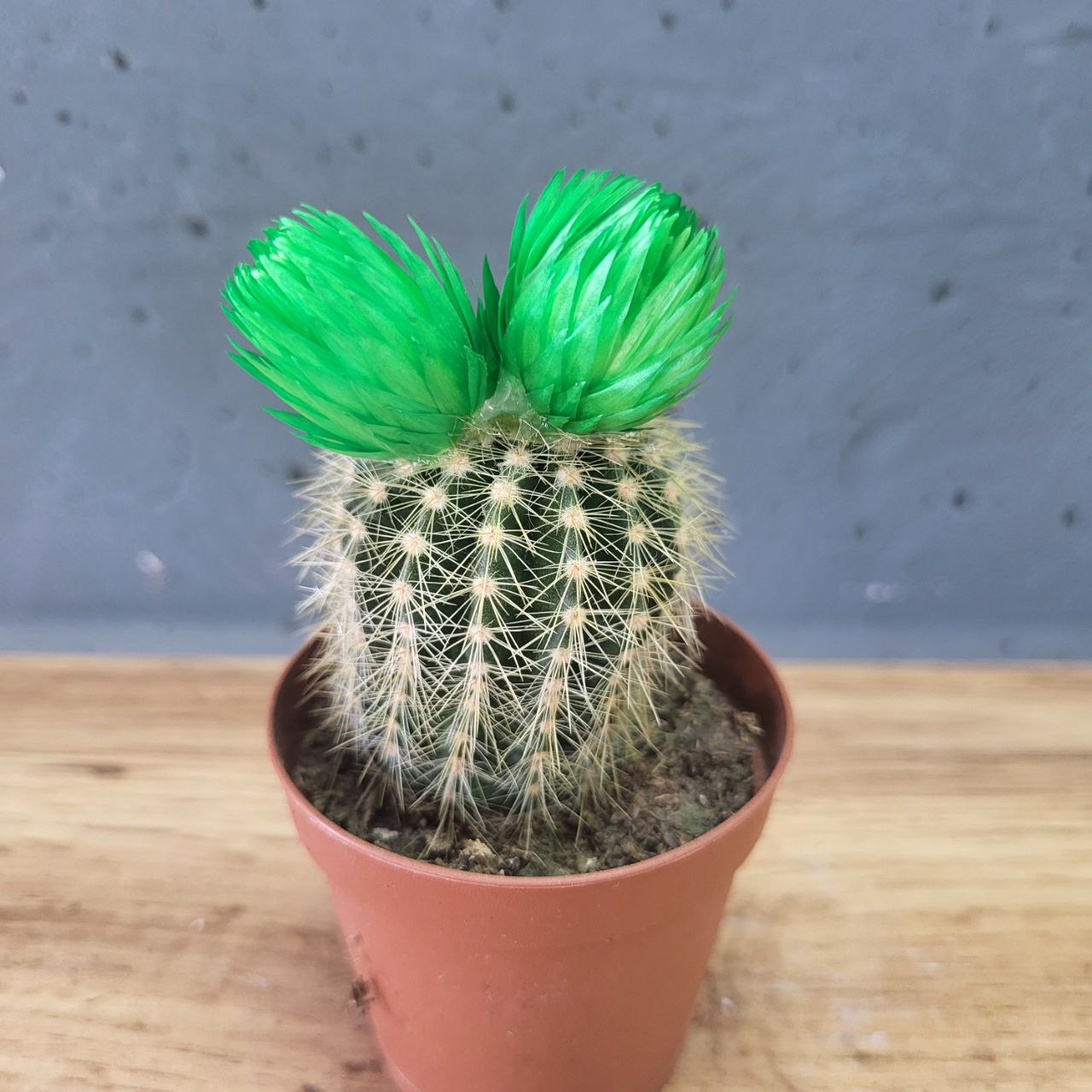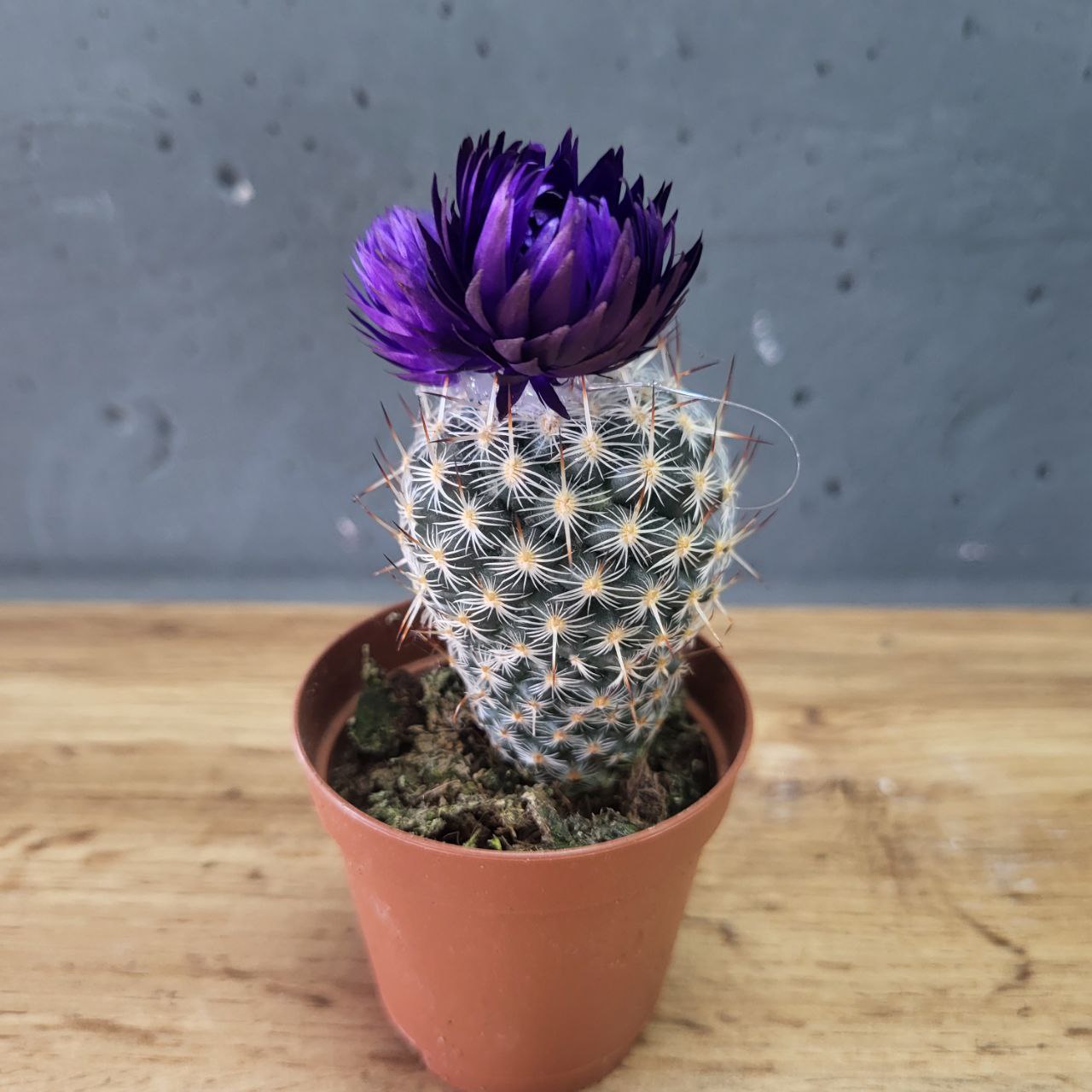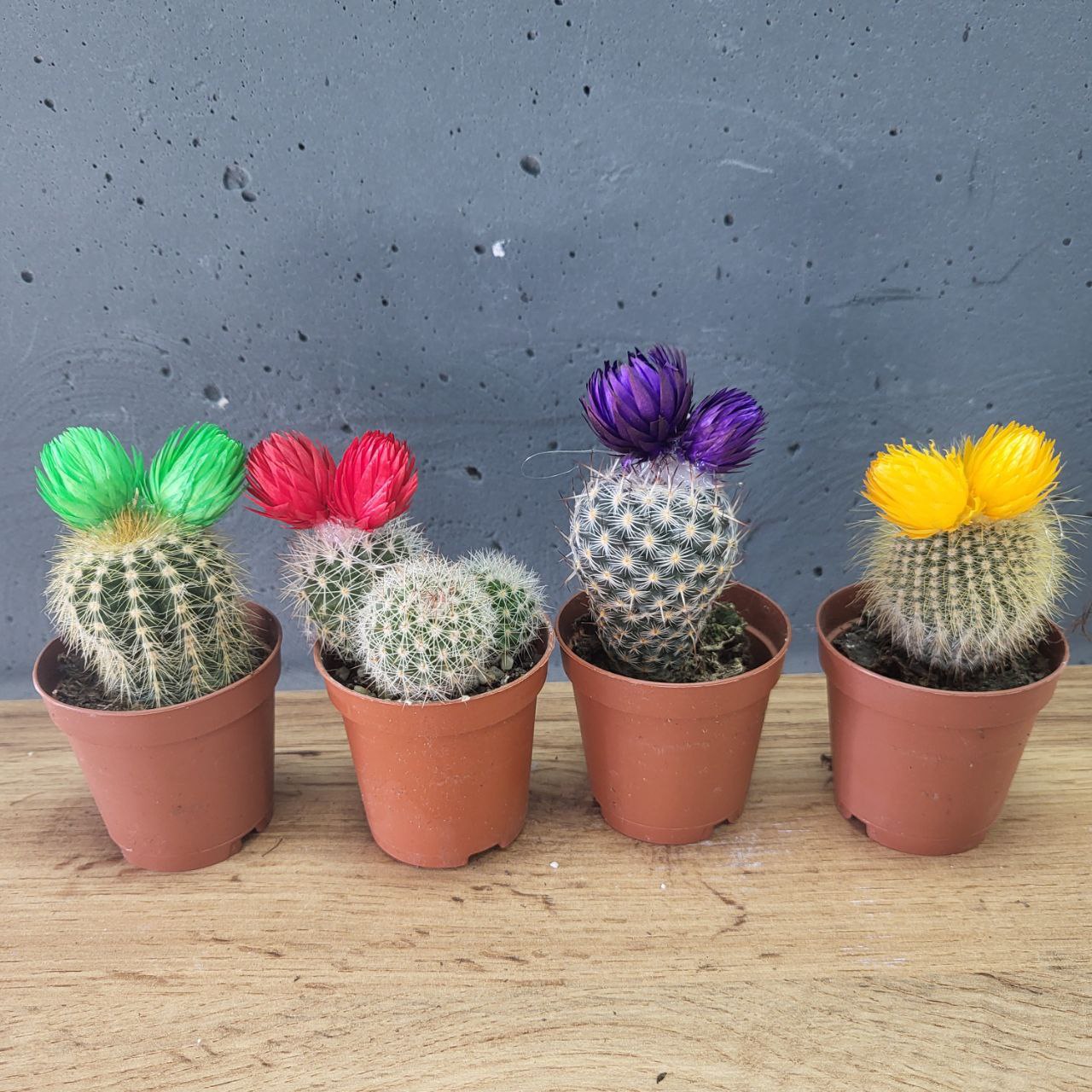 Кактус зі штучними квітами. Розмір рослини: 5х10см.  Діаметр горщику: 5см. Колір квітки: жовтий, зелений, червоний, фіолетовий