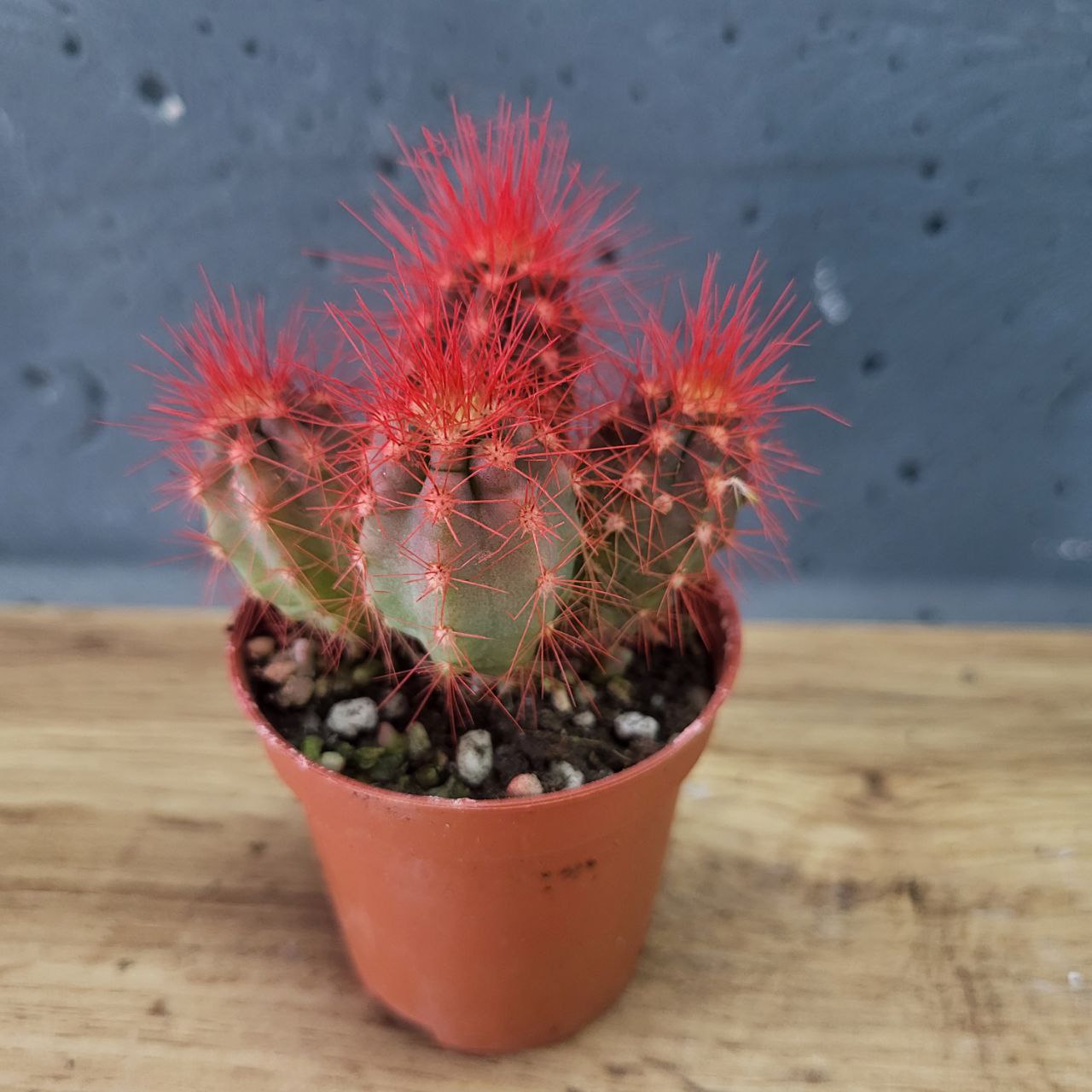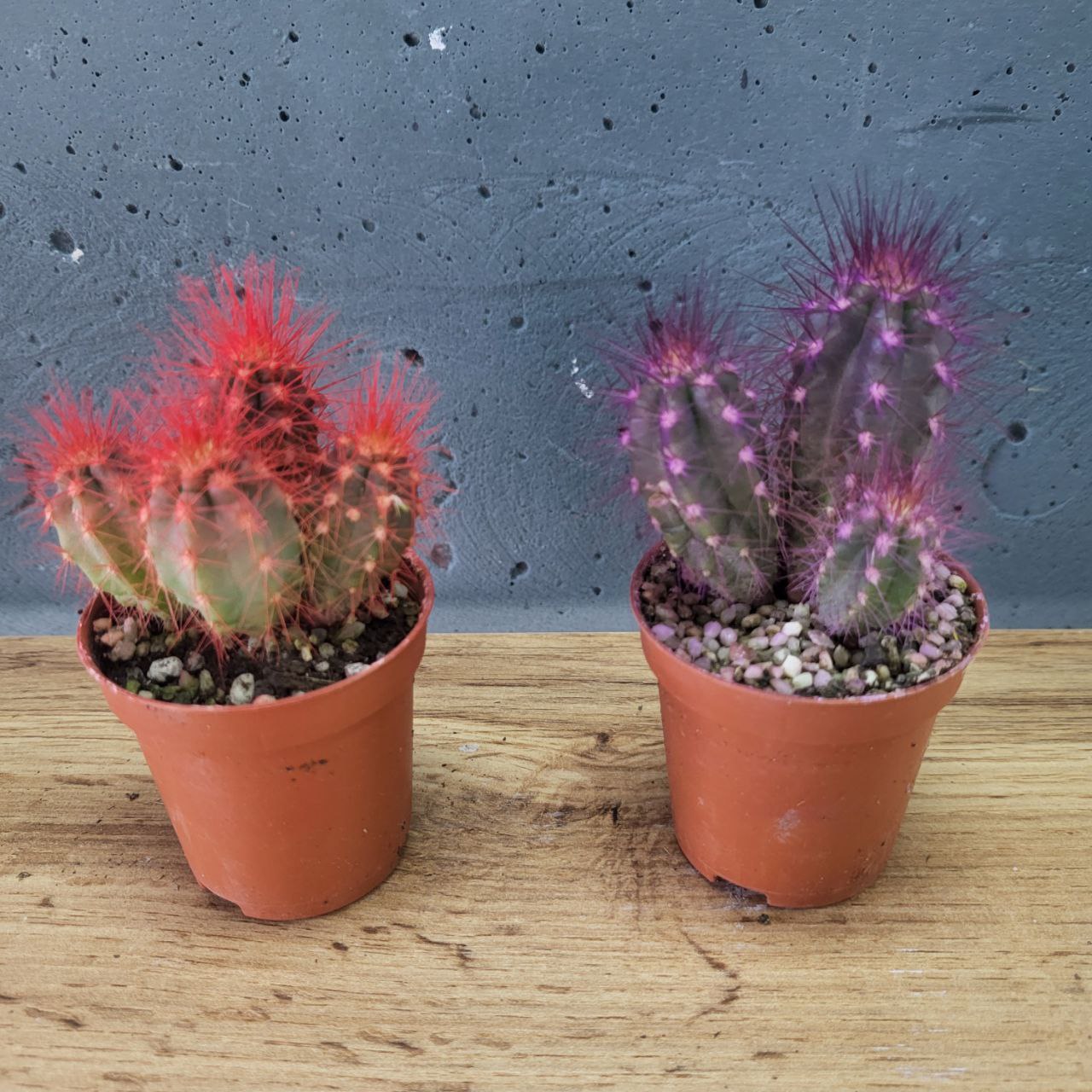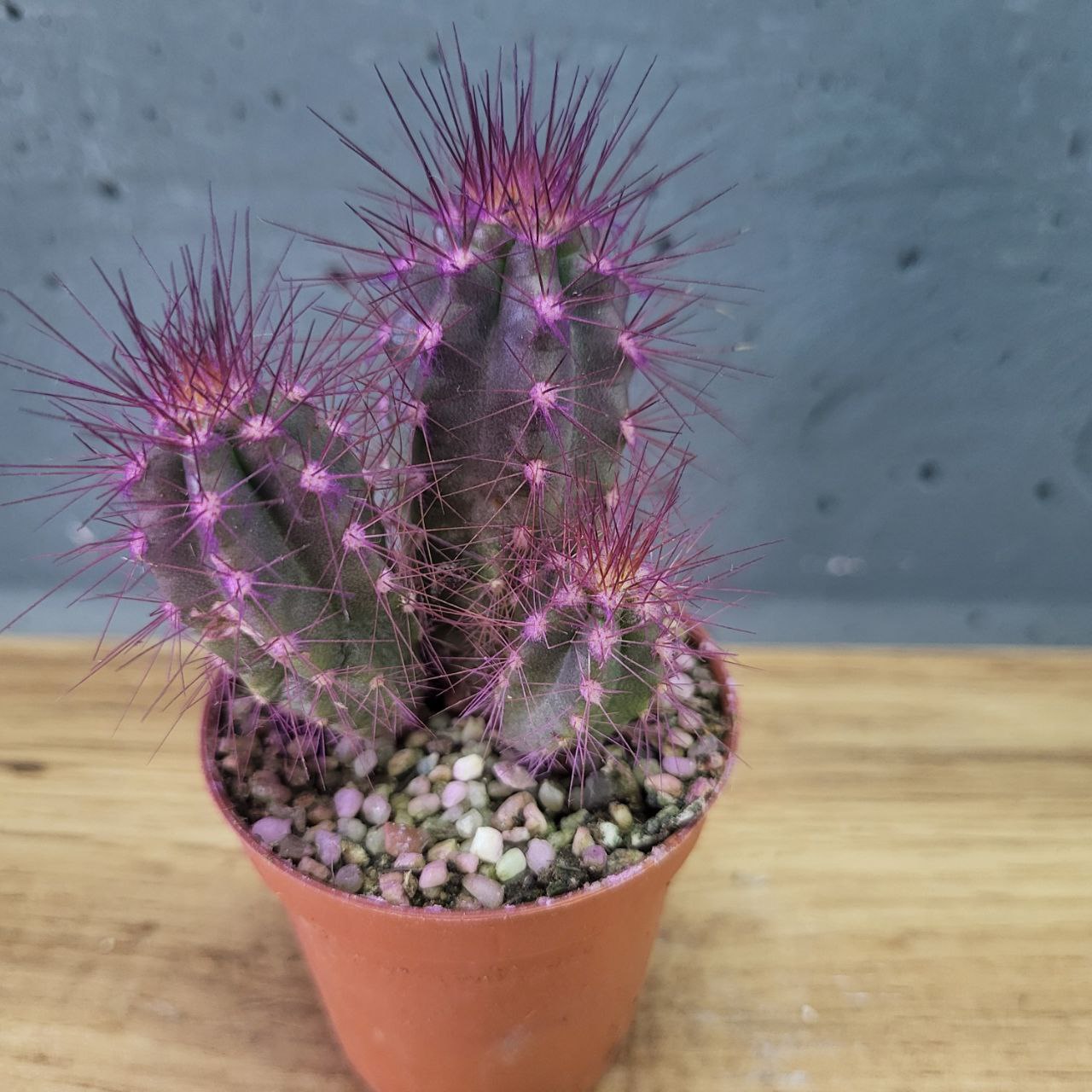 Кактус з різнокольоровими колючками. Розмір рослини: 5х8см. Діаметр горщику: 5см. Кольори рослини: фіолетовий, червоний