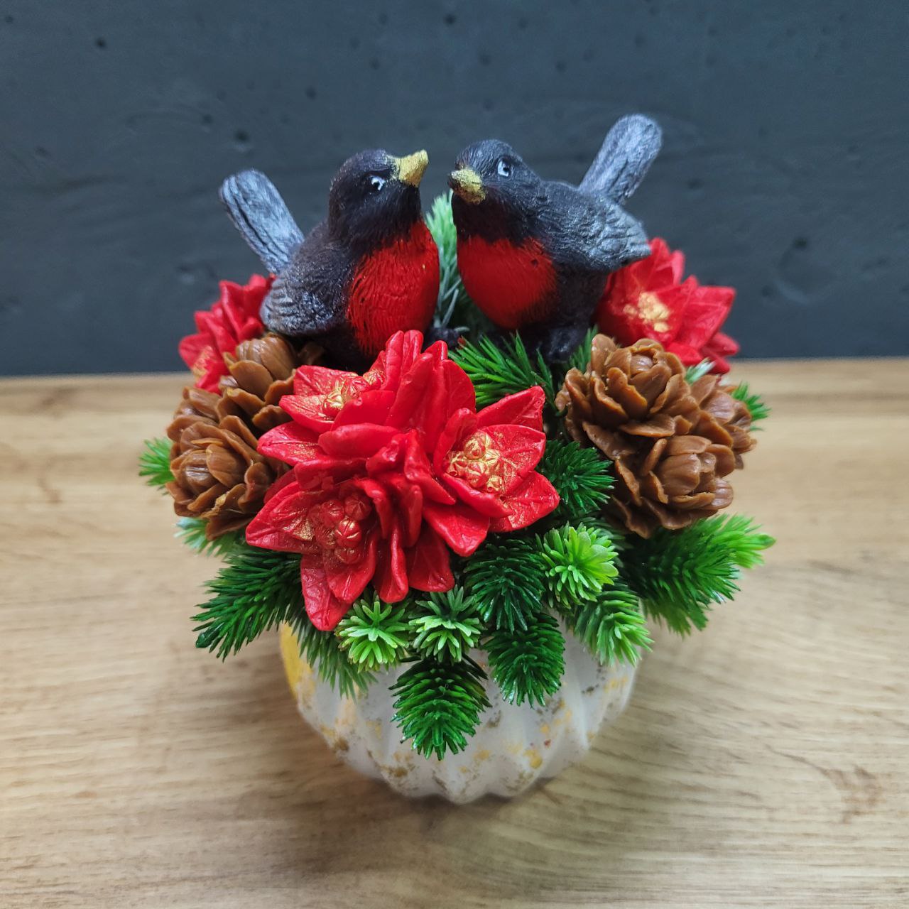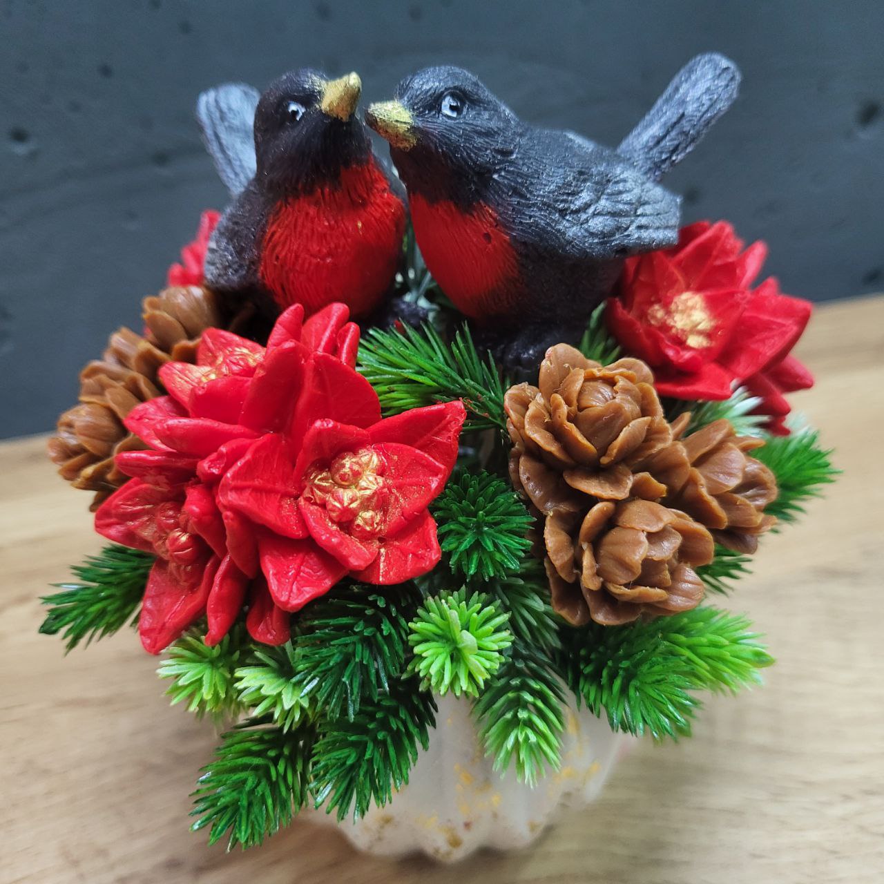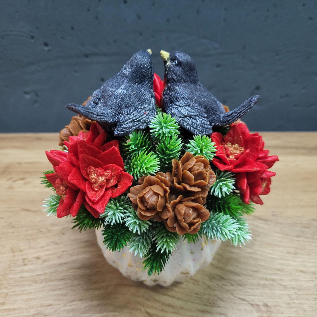Композиція новорічна з снігурями Розмір 12х12х14см Склад: горщик – гіпс; птахи, квіти, шишки – мило; зелень – пластик. Мило ручної роботи виготовлене з високоякісної мильної основи та барвників виробництва Україна, парфумерна композиція виробництва Франція