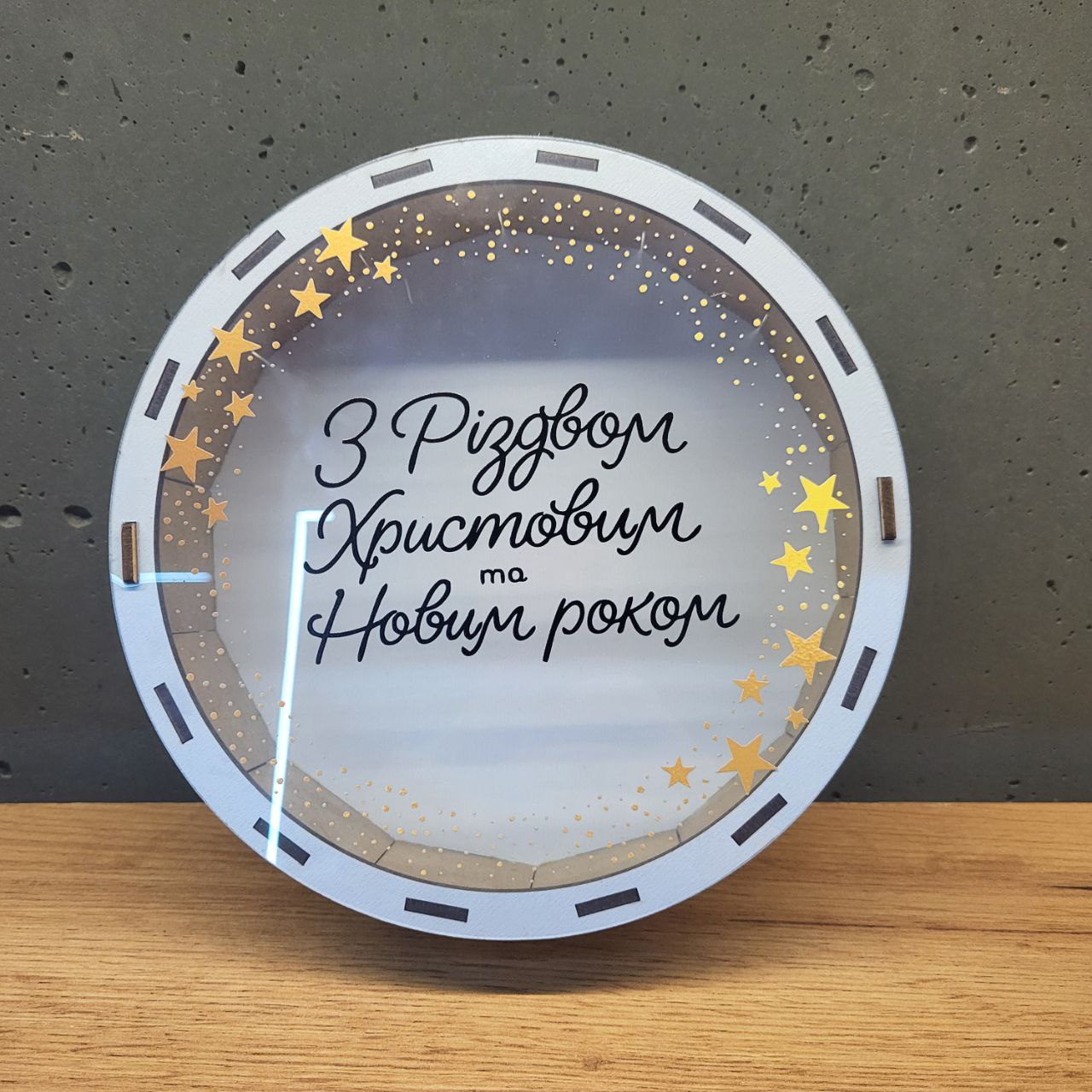 Коробка кругла з прозорою кришкою (20 см в діаметрі). «З Різдвом Христовим та Новим Роком». Оригінальний спосіб запакувати ваші подарунки