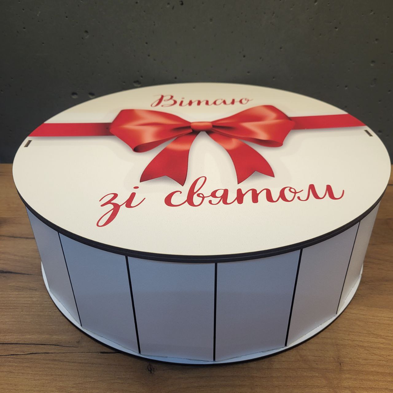 Коробка кругла 34см в діаметрі, висота 10см. «Вітаємо зі святом». Оригінальний спосіб запакувати ваші подарунки