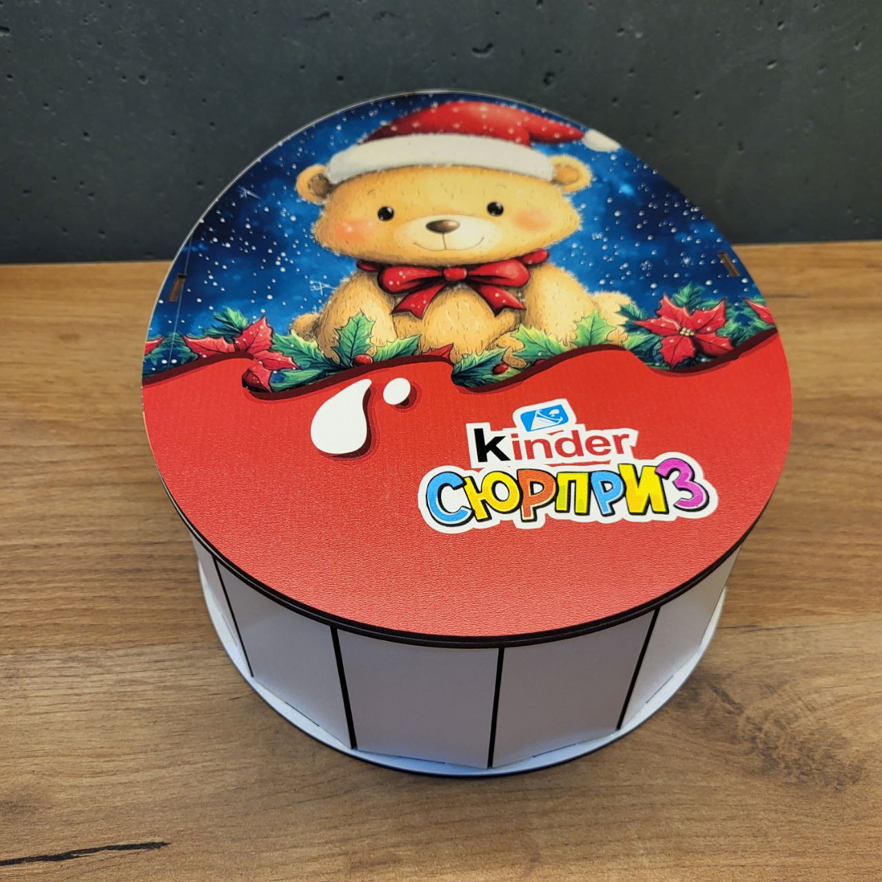 Коробка новорічна Кіндер з ведмедиком. Розмір 28х21х9см Матеріал – фанера