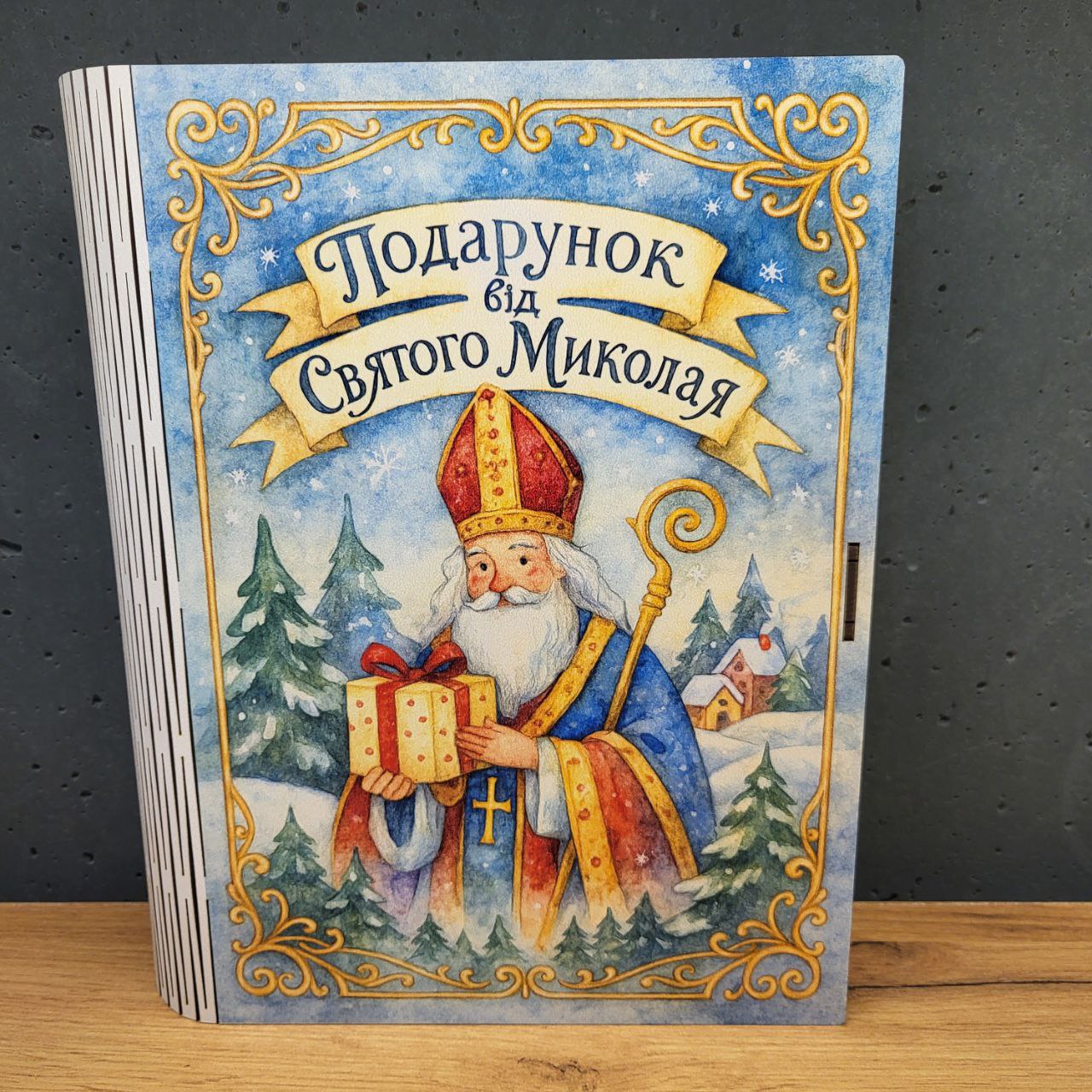 Коробка у вигляді книги від Святого Миколая. Коробка у вигляді книги 25х20х6см “Подарунок від Святого Миколая” Матеріал – фанера