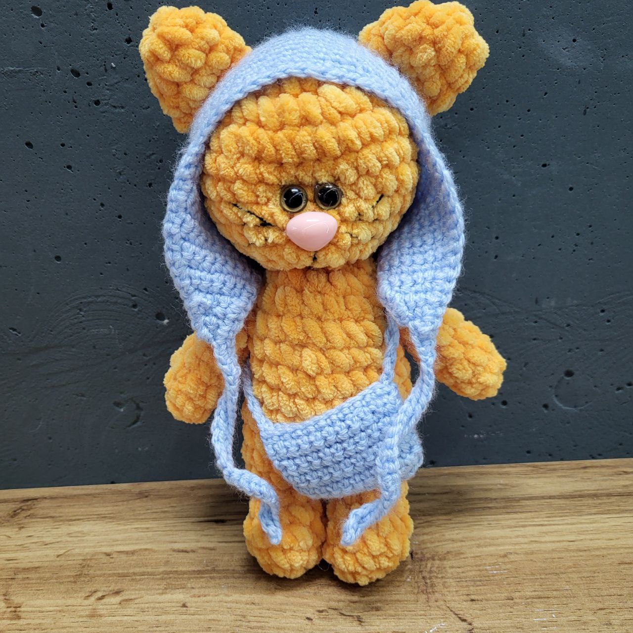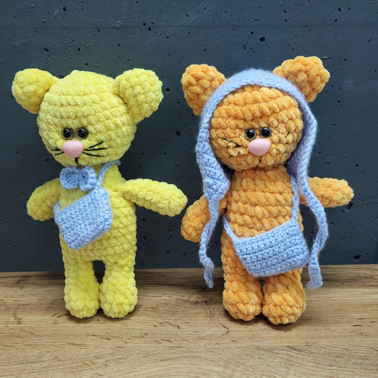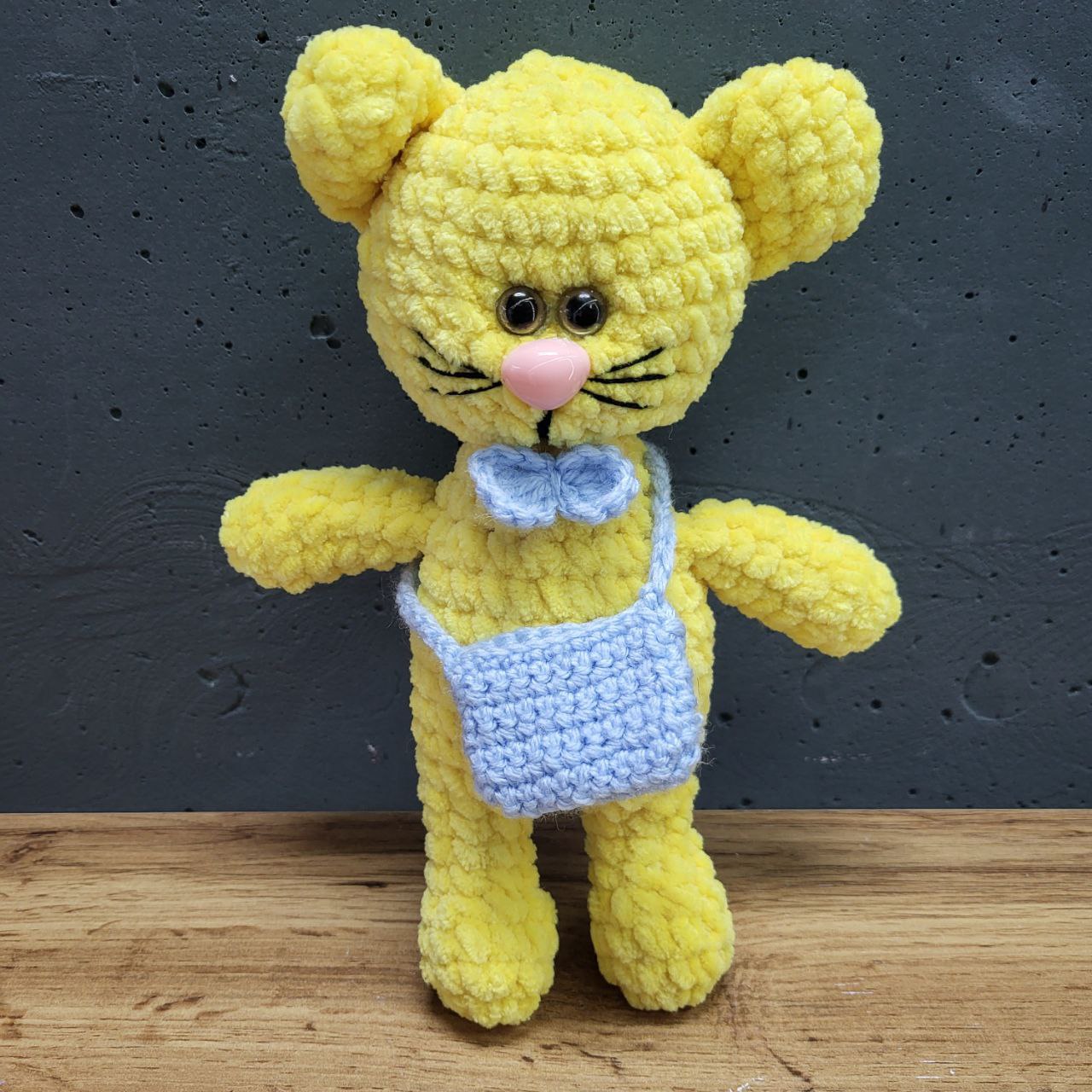 Котик з сумкою. Наявні кольори котиків: жовтий, помаранчевий. Ручна роботи. Розмір котика: 22см. М’яка іграшка ручної роботи – класика серед дитячих іграшок, яка ніколи не втрачає актуальності. Вона стане найкращим другом для дитини та приємним подарунком для дорослого. Іграшка виготовлена з безпечних та приємних на дотик матеріалів, що підходять для дітей.