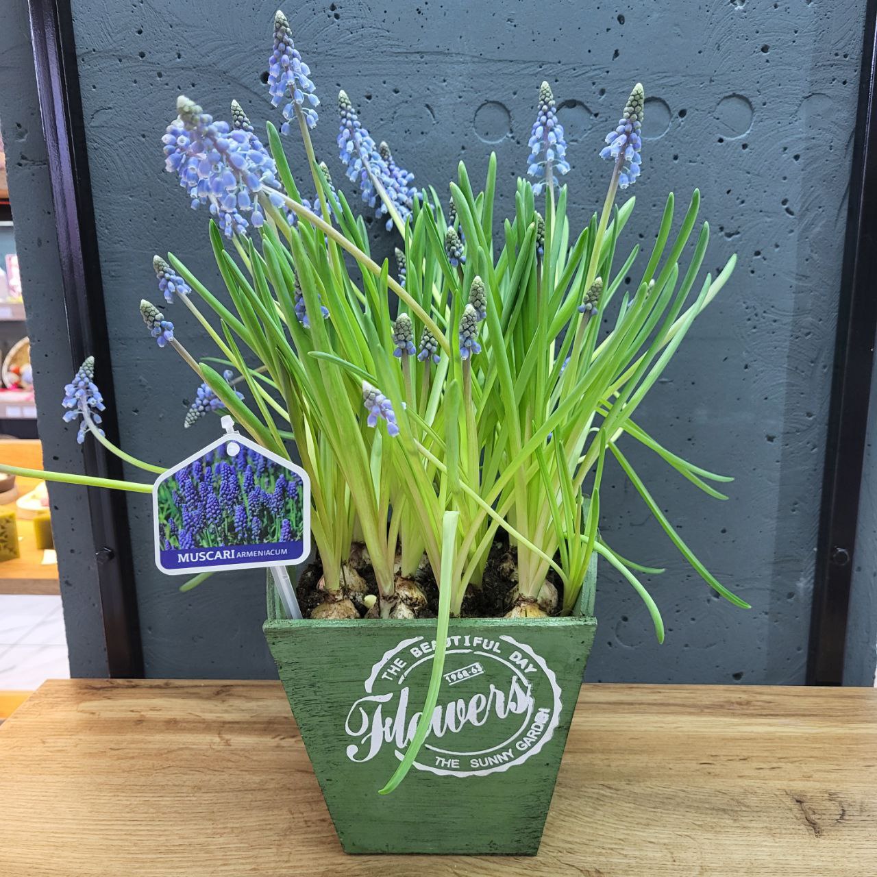 Мускарі в деревʼяному горщику. Розміри рослини в горщику: 15х15х40см. Колір рослини блакитний. Горщик: білий, зелений. Ідеальний подарунок мамі, дружині, жінці, колезі. Гарно почуває себе, як вдома на підвіконні так і в саду.
