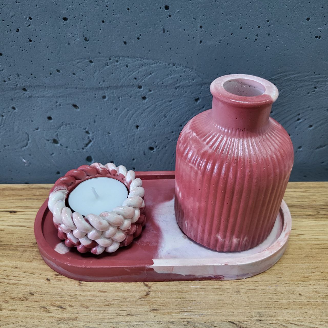 набір виробів з бетону білий з бордовим з вазою та підсвічником