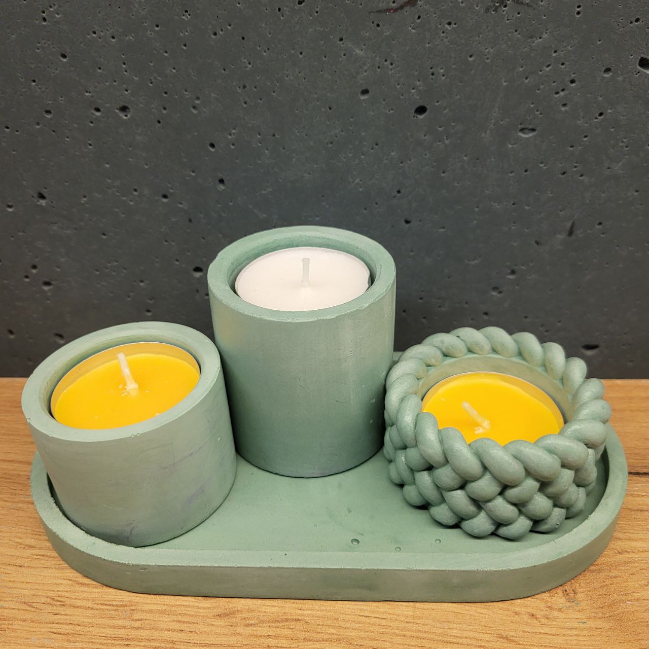 набір виробів з бетону зелений. набір виробів з бетону з 4 предметів: 3-ри підсвічники, підставка. Колір набору – зелений. Вироби покриті лаком. Ручна робота. Також ви можете замовити пакування в святкову коробку, святковий папір – просто оберіть потрібне при оформленні замовлення або перейдіть в розділ пакувальні коробки чи послуги