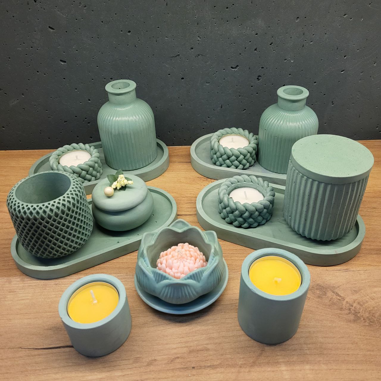 набір виробів з бетону зелений. До набору входять 16 предметів. Ручна робота. Вироби з бетону та гіпсу — це поєднання сучасного дизайну, природної текстури та ручної роботи. 🛒 Приймаємо індивідуальні замовлення. Нанесення вашого бренду на товари