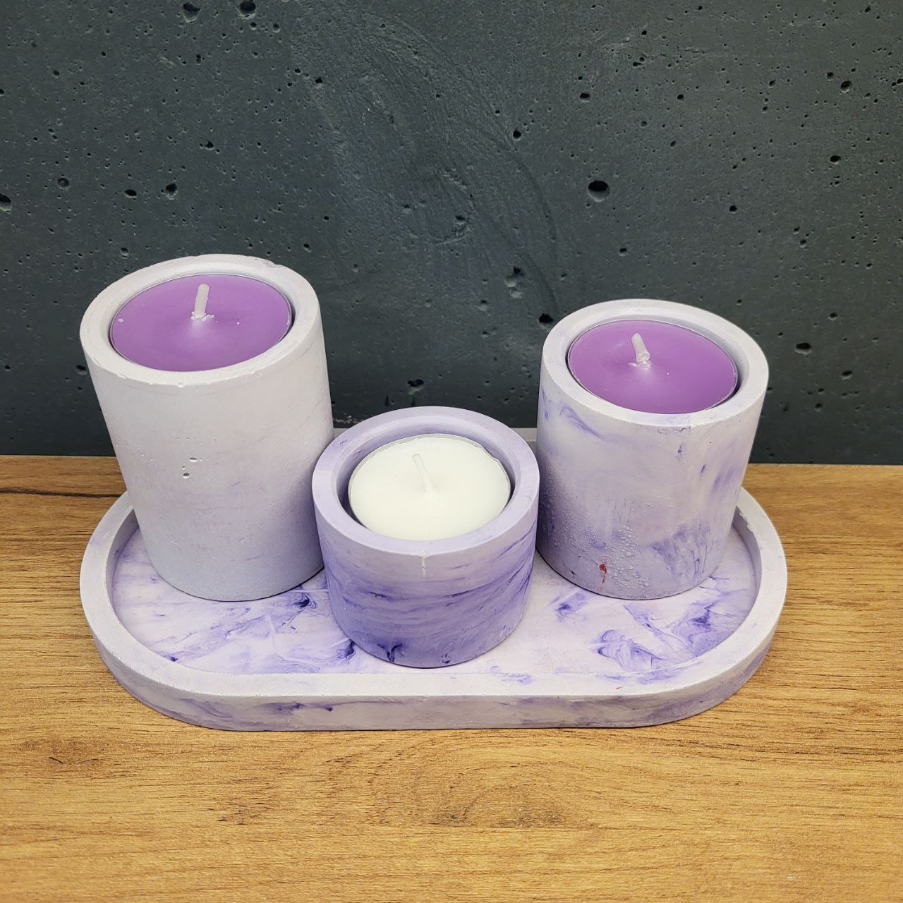 набір виробів з бетону – колір білий з лавандовим. набір виробів з бетону з 4 предметів: 3-ри підсвічники, підставка. Набір кольору – білий з лавандовим. Вироби покриті лаком. Ручна робота. Також ви можете замовити пакування в святкову коробку, святковий папір – просто оберіть потрібне при оформленні замовлення або перейдіть в розділ пакувальні коробки чи послуги