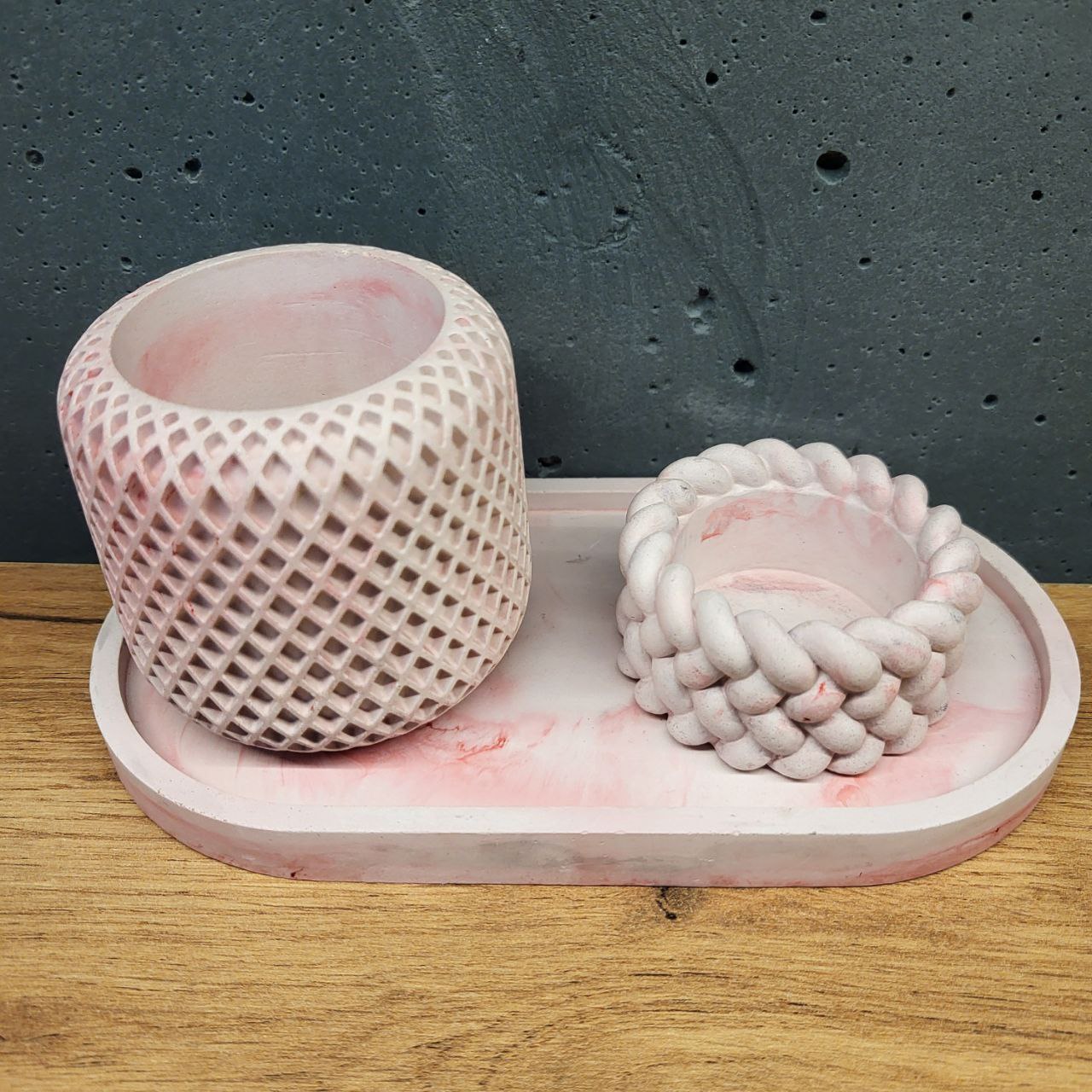 набір виробів з бетону – колір білий з рожевим. набір виробів з бетону з 3 предметів: підсвічник, горщик, підставка. Набір кольору – білий з рожевим. Вироби покриті лаком. Ручна робота. Також ви можете замовити пакування в святкову коробку, святковий папір – просто оберіть потрібне при оформленні замовлення або перейдіть в розділ пакувальні коробки чи  послуги