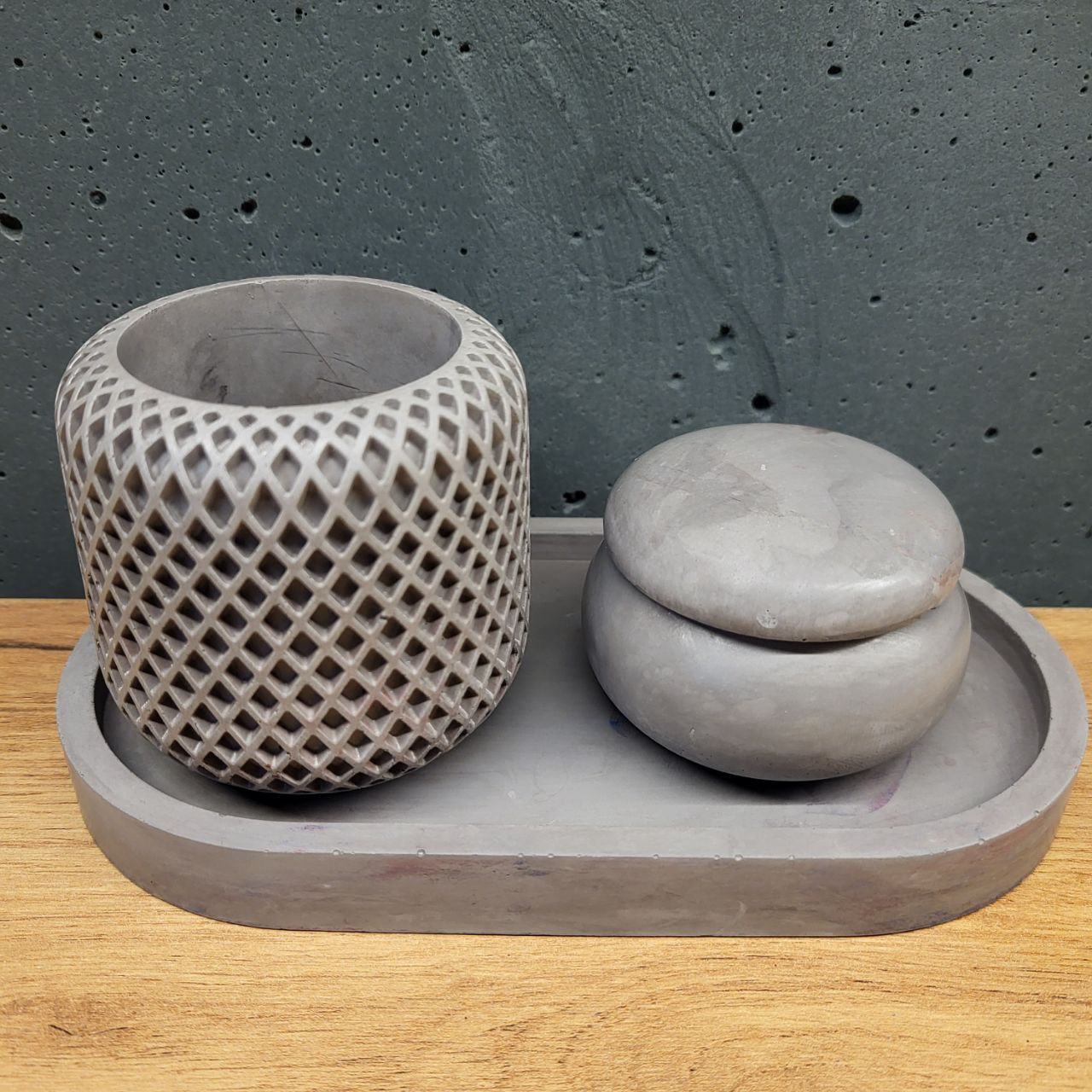 набір виробів з бетону – колір сірий (бетон). набір виробів з бетону з 3 предметів: горщик, підсвічник з кришечкою, підставка. Набір кольору – сірий (бетон). Вироби покриті лаком. Ручна робота. Також ви можете замовити пакування в святкову коробку, святковий папір – просто оберіть потрібне при оформленні замовлення або перейдіть в розділ пакувальні коробки чи послуги