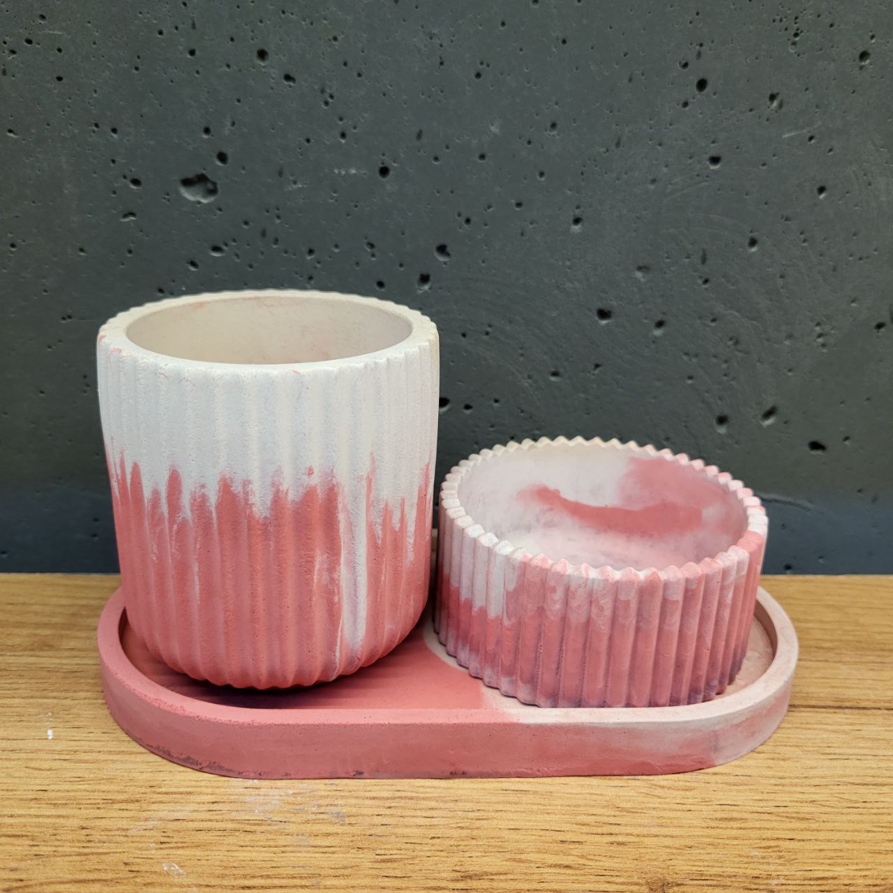 горщик та підсвічник з полосою з бетону. Набір виробів з бетону рожево-білого кольору з горщиком та підсвічником. До набору входять 3 предмети. Ручна робота з декоративного бетону покрита лаком
