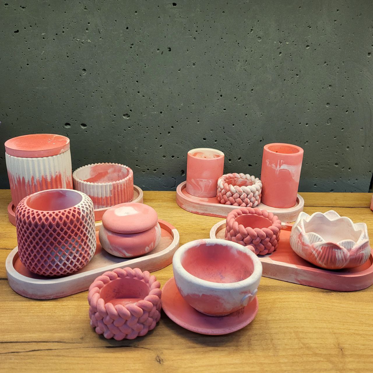 Набір виробів з бетону рожево-білого кольору. До набору входять 16 предметів. Ручна робота з декоративного бетону