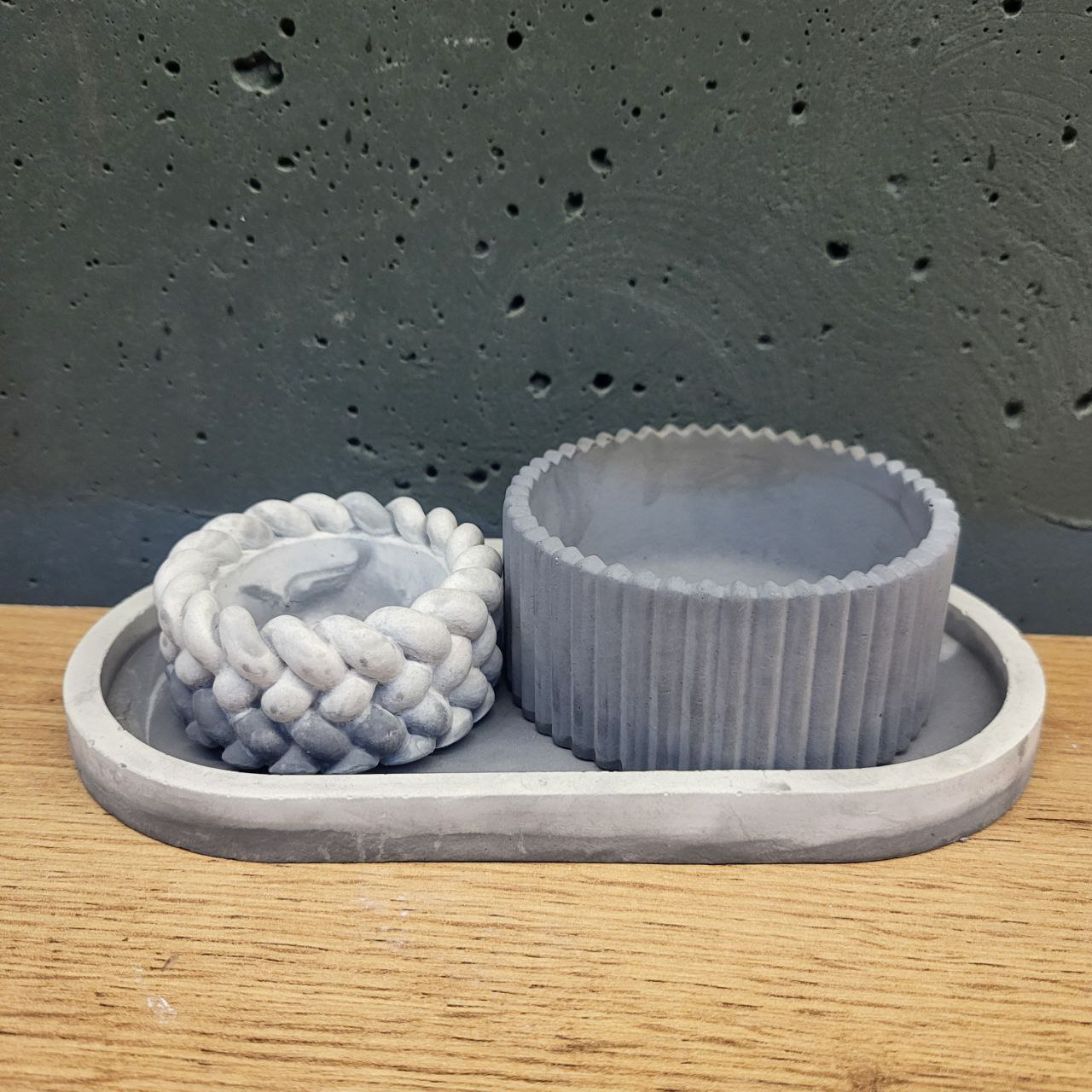 набір виробів з бетону, колір сірий з білим. Два підсвічники. До набору входять 3 предмети. Ручна робота з декоративного бетону покрита лаком
