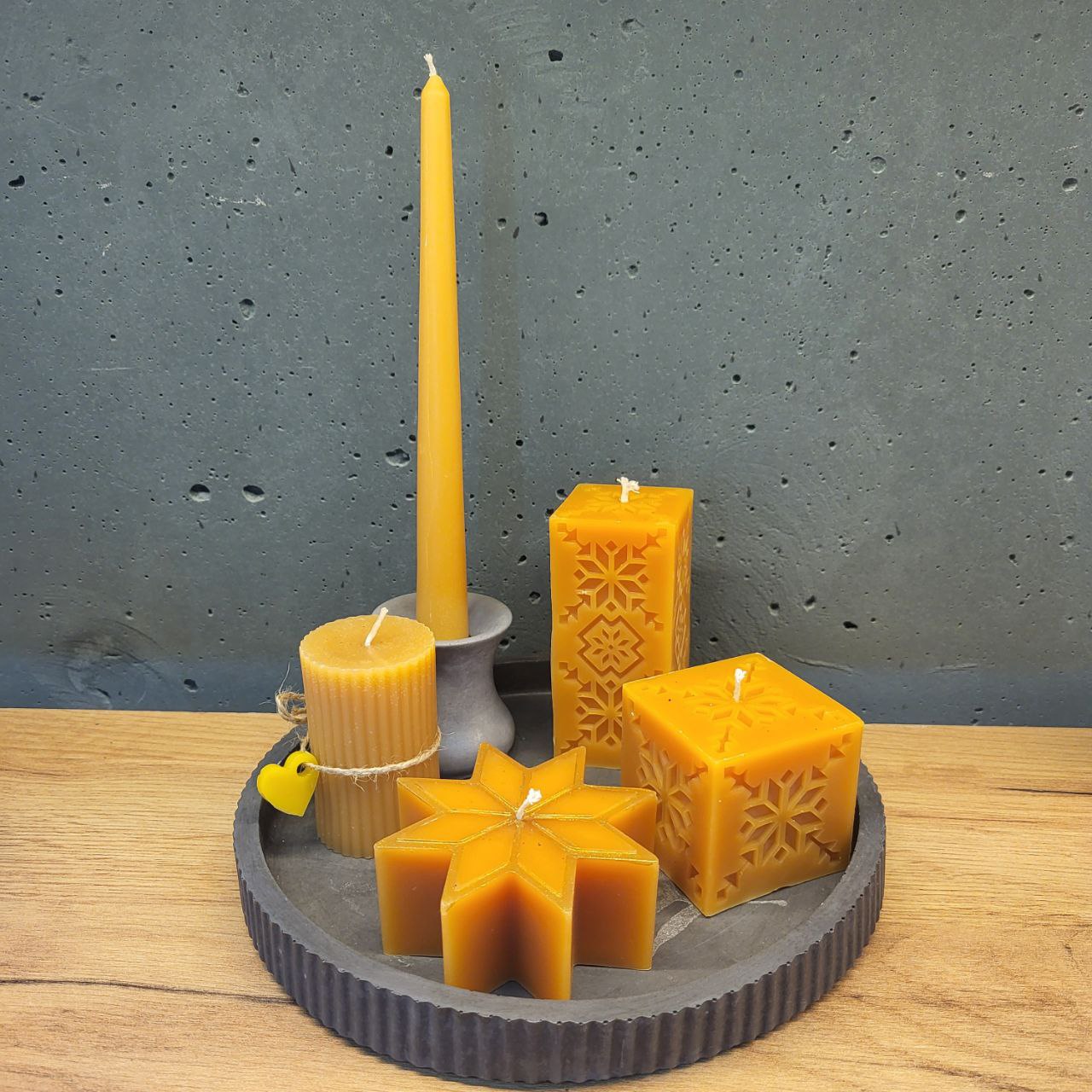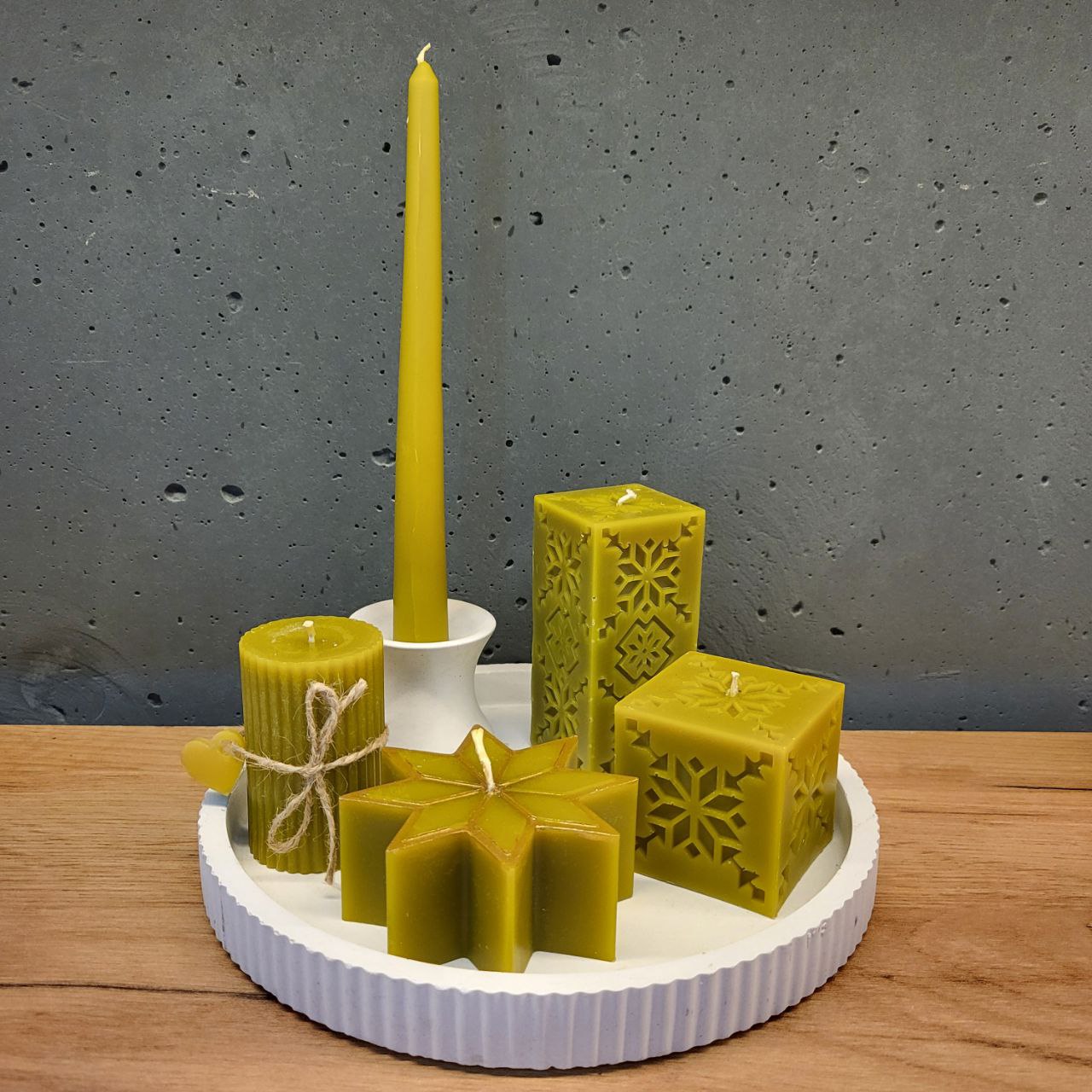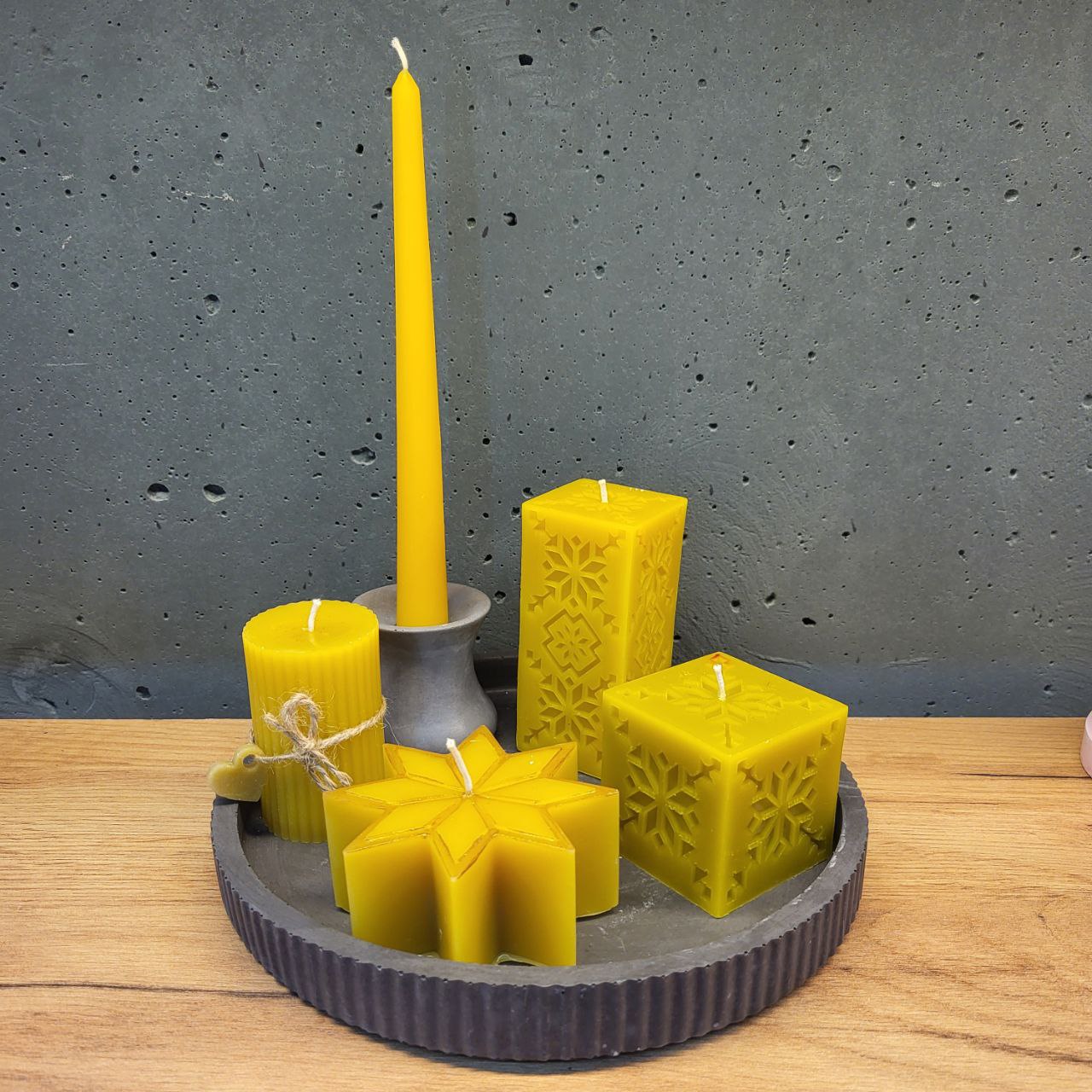 Ручна робота. Набір Різдвяний свічки та підсвічники (7шт). Склад свічки: бджолиний віск. До набору входить: підсвічники з бетону, підставка з бетону. Кольори: жовтий, зелений, темно-помаранчевий