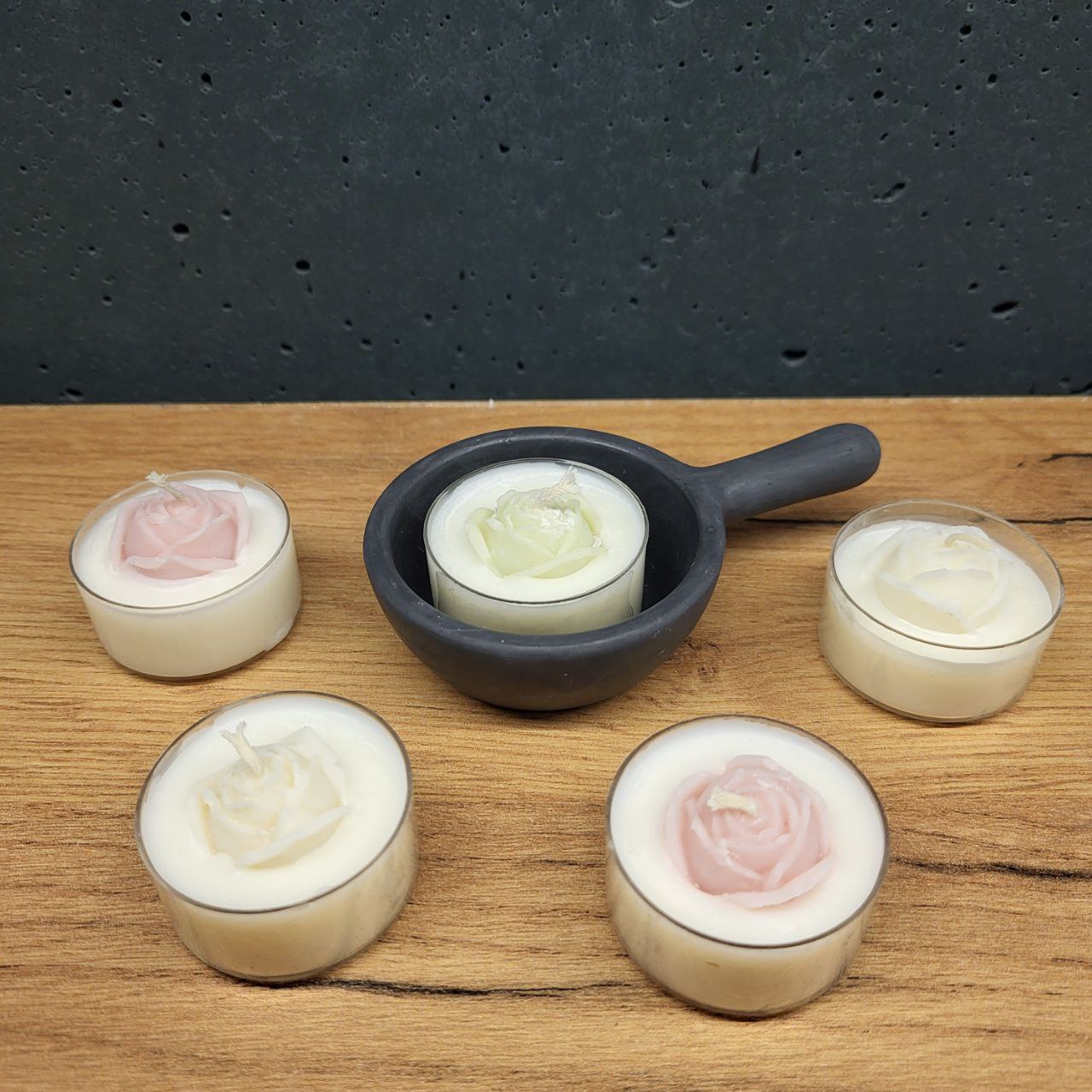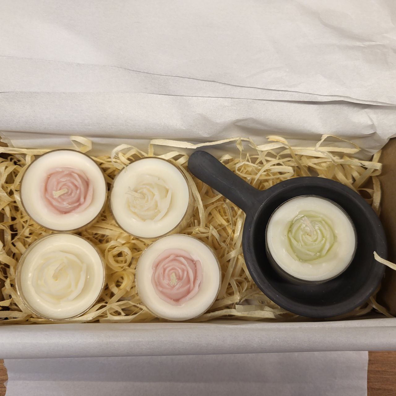 Набір свічок: 5 чайних свічок-троянд і підсвічник в коробці з декоративною тирсою і листівкою. Розмір коробки – 20х6х8см