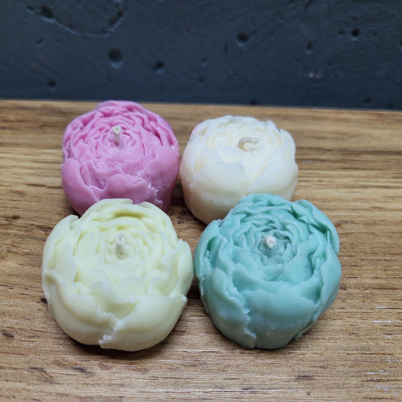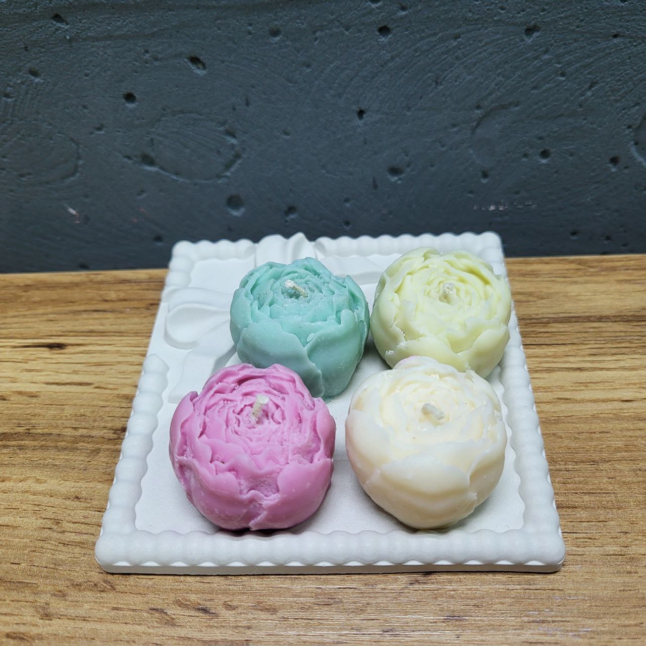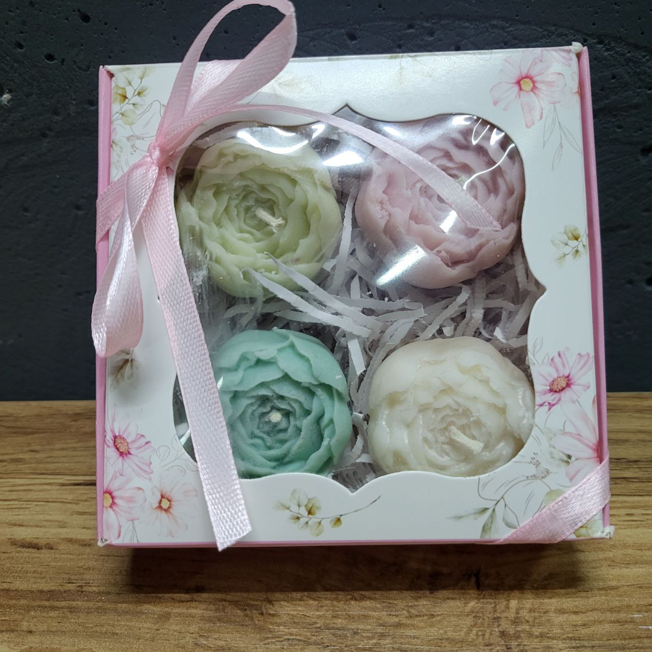 Набір свічок у формі квітки півонії. В наборі 4 свічки у формі квітки півонії. Свічки запаковано в подарункову коробку. Розмір коробки 10х10х3см. Свічки без аромату. Матеріал: віск соєвий