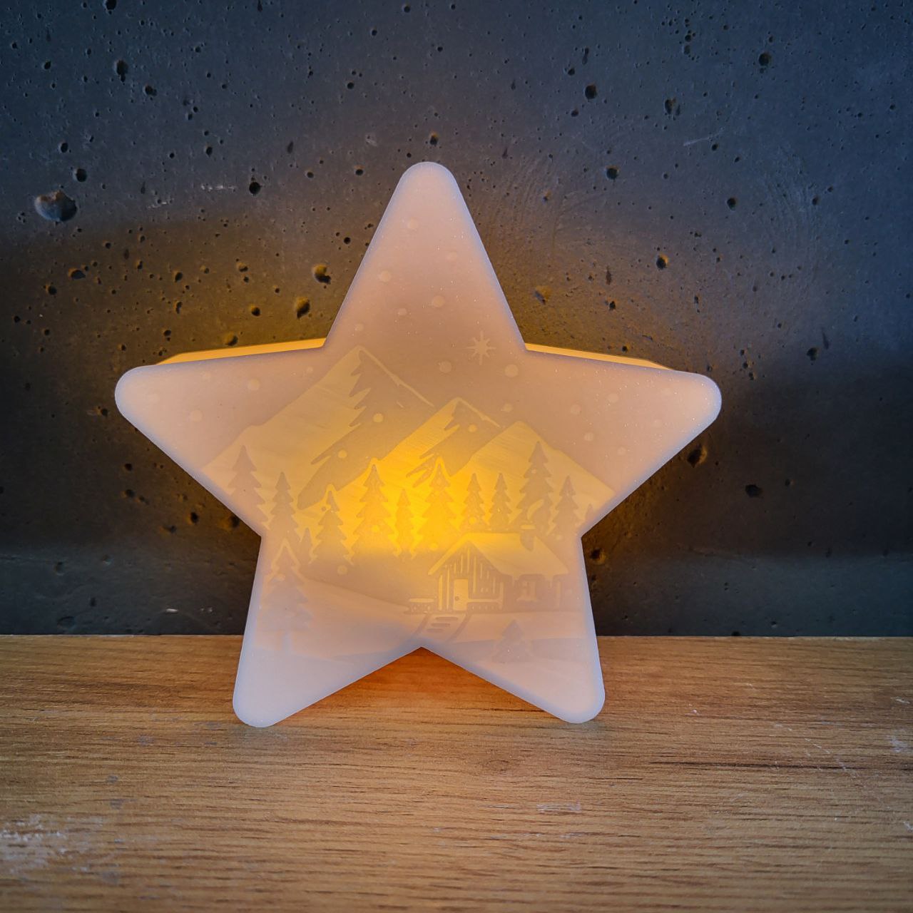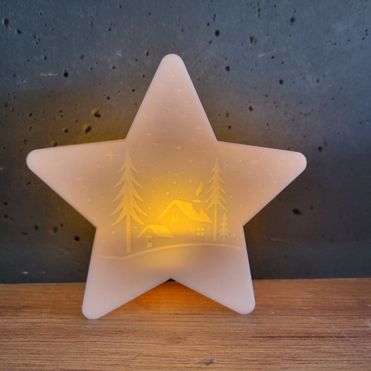 Новорічна зірка (ліхтар)-нічник. Світлова зірка з зимовим сюжетом і теплим м’яким світлом. Створює затишну атмосферу, красиво виглядає ввечері та підходить для святкового декору або подарунка. Висота 12 см. В комплекті світловий елемент з джерелом живлення