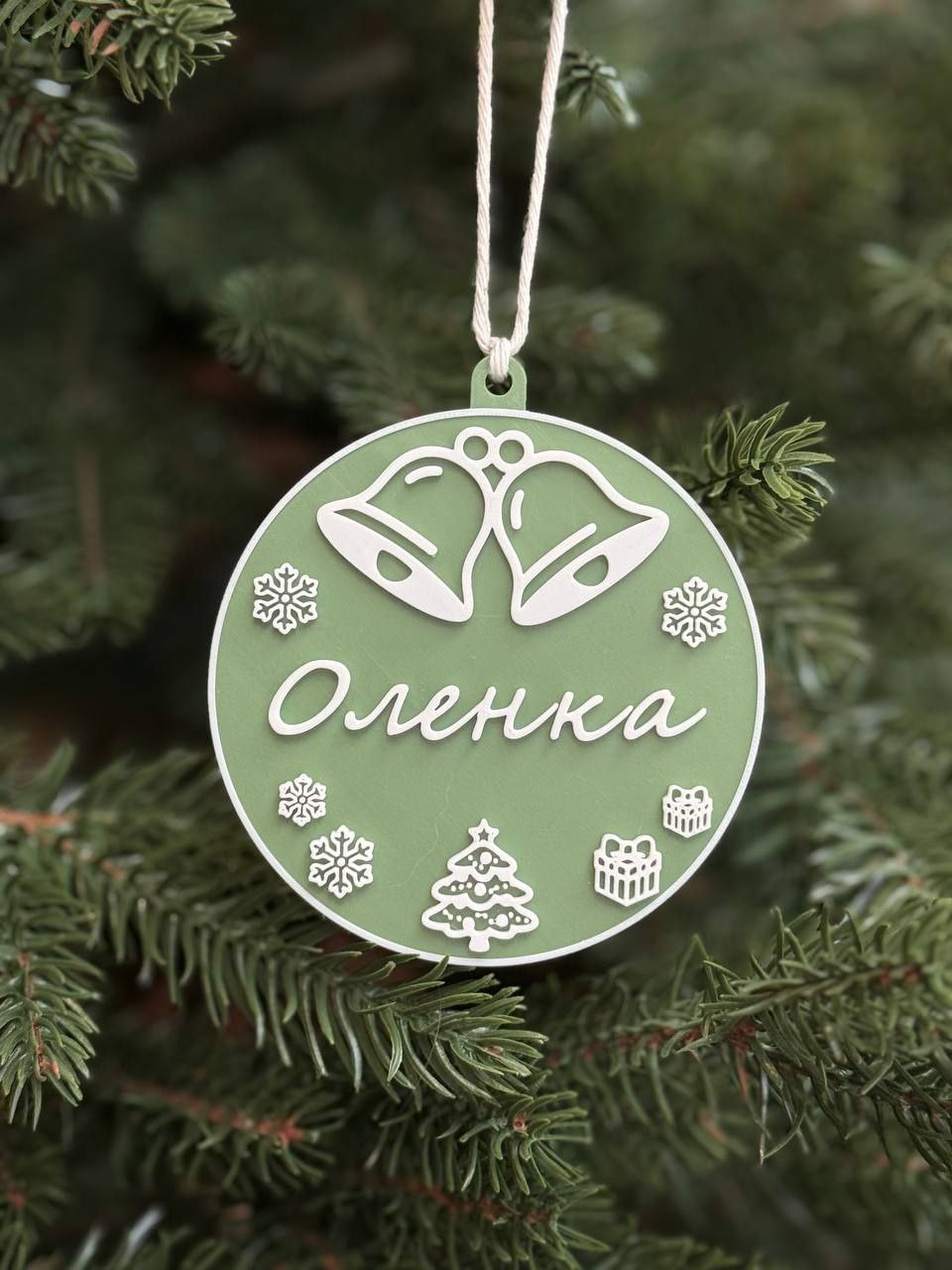 Новорічна іменна іграшка на ялинку (дизайн з дзвіночками). Опис: Новорічна іменна прикраса зі святковим дизайном. Легкий та стильний акцент для вашої ялинки або маленький подарунок з увагою до деталей. Діаметр 8 см. Можливе індивідуальне замовлення: обирайте власний колір і будь-який напис. Виробництво Україна