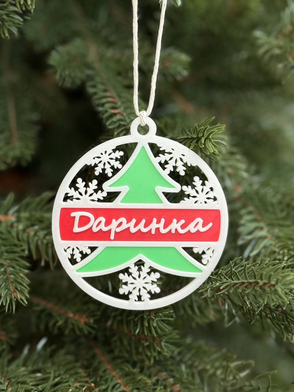 Новорічна іменна іграшка на ялинку (дизайн з ялинкою). Опис: Новорічна іменна прикраса зі святковим дизайном. Легкий та стильний акцент для вашої ялинки або маленький подарунок з увагою до деталей. Діаметр 8 см. Можливе індивідуальне замовлення: обирайте власний колір і будь-який напис. Виробництво Україна