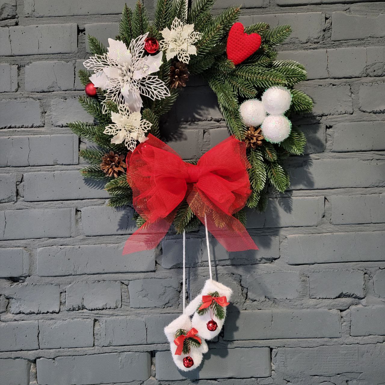 Стильний святковий віночок, який створить атмосферу свята ще з порогу! Ручна робота з штучної м’якої хвої, декорований білими блискучими квітами, ніжним сніговим акцентом та елегантною стрічкою. Ідеально підходить для дверей, каміну чи фотозони.