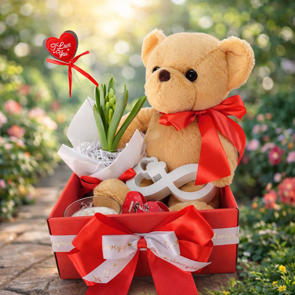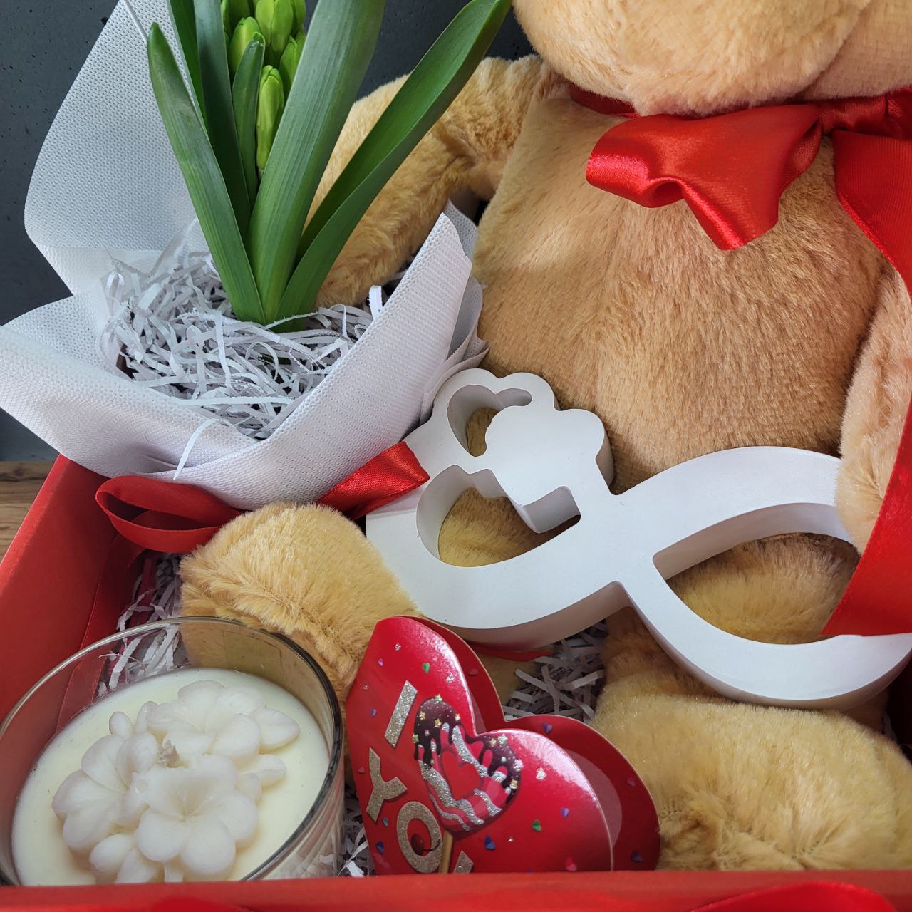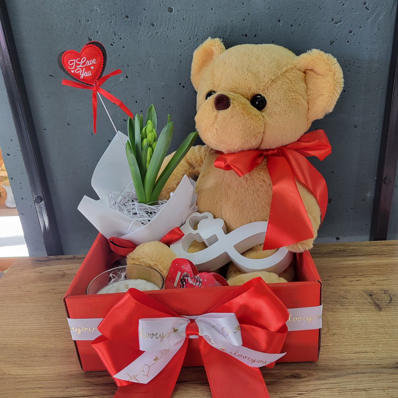 Подарунковий бокс з Ведмедиком та геоцинтом до Дня Валентина. Розмір набору: 24х31см. До набору входить: Плюшевий ведмедик розміром 35см, жива квітка – геоцинт 10х20см, ароматизована свічка Гортензія 8х6см, статуетка «нескінченне кохання» з сердечками 14х6см, подарункова коробка: 24х24х9см декор сердечко. Підходить до Дня Закоханих, на День народження, до Свята весни, до 8 березня