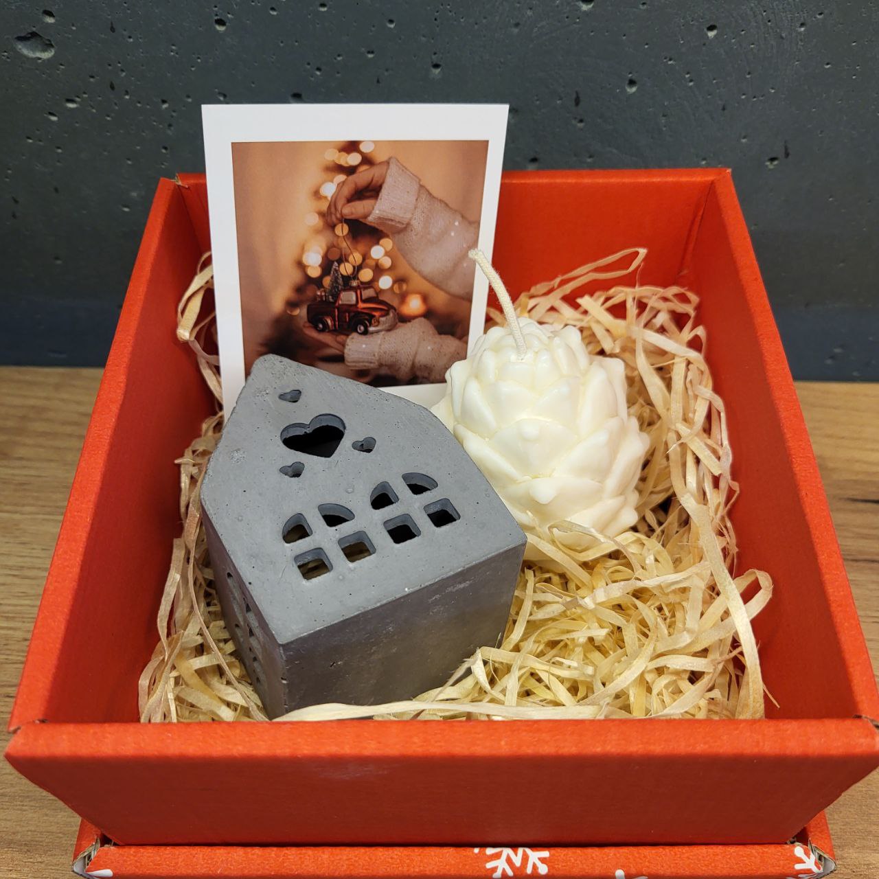 подарунковий набір: виріб з бетону та свічка шишка. Сірий набір з 2 предметів: свічка-шишка декоративна, будиночок декоративний. Всі вироби ручної роботи. Набір запаковано в подарункову коробку з наповненням, та святковою стрічкою. Ви отримаєте вже готовий подарунок без зайвої біганини по крамницях