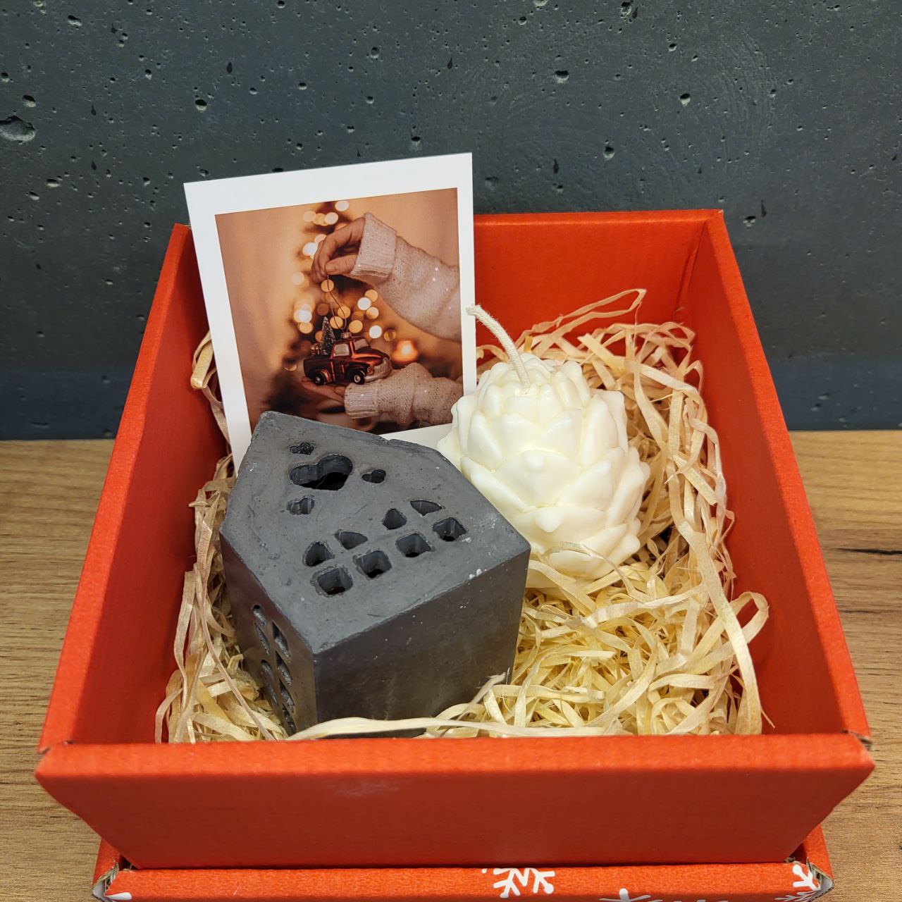 подарунковий набір: виріб з бетону та свічка шишка. Чорний набір з 2 предметів: свічка-шишка декоративна, будиночок декоративний. Всі вироби ручної роботи. Набір запаковано в подарункову коробку з наповненням, та святковою стрічкою. Ви отримаєте вже готовий подарунок без зайвої біганини по крамницях