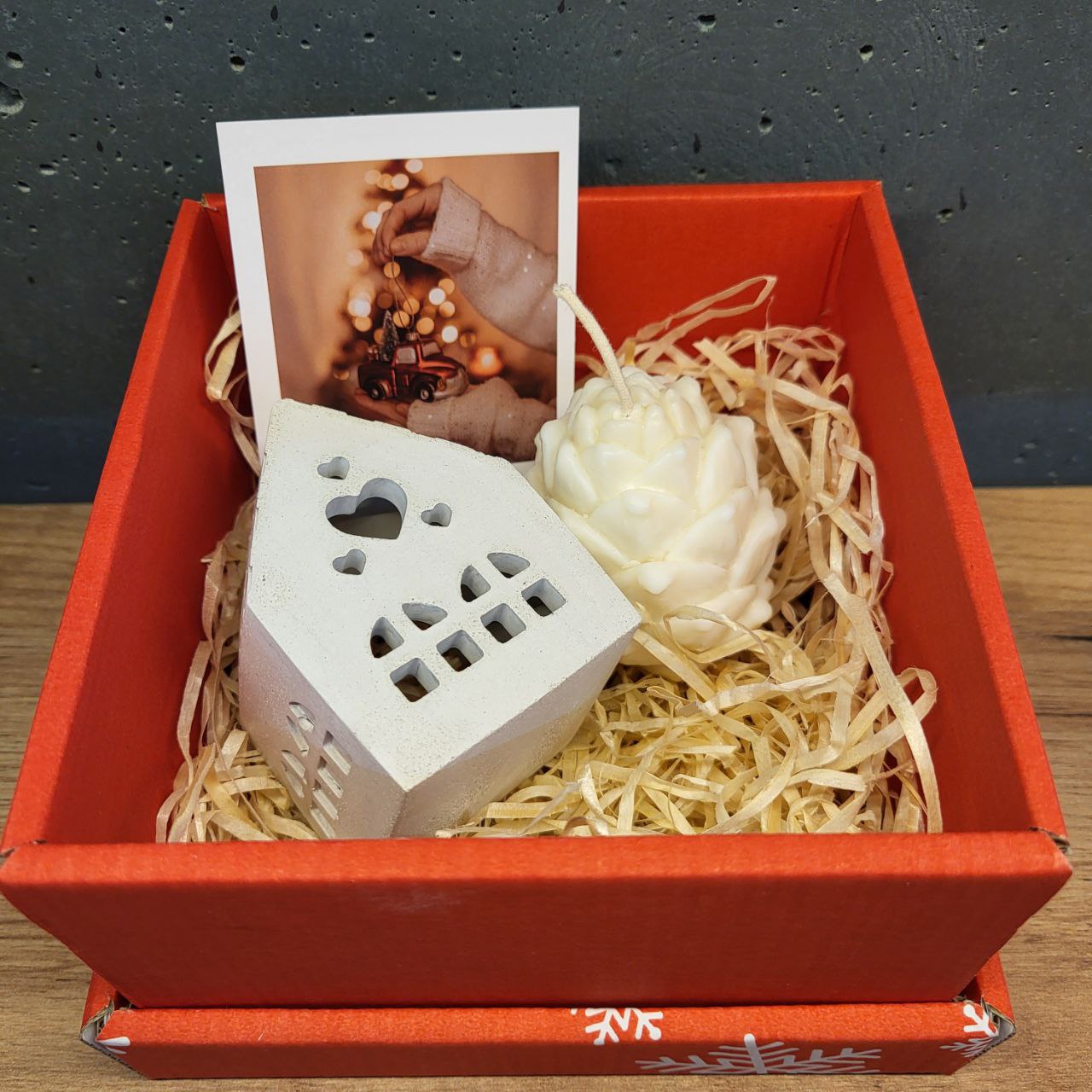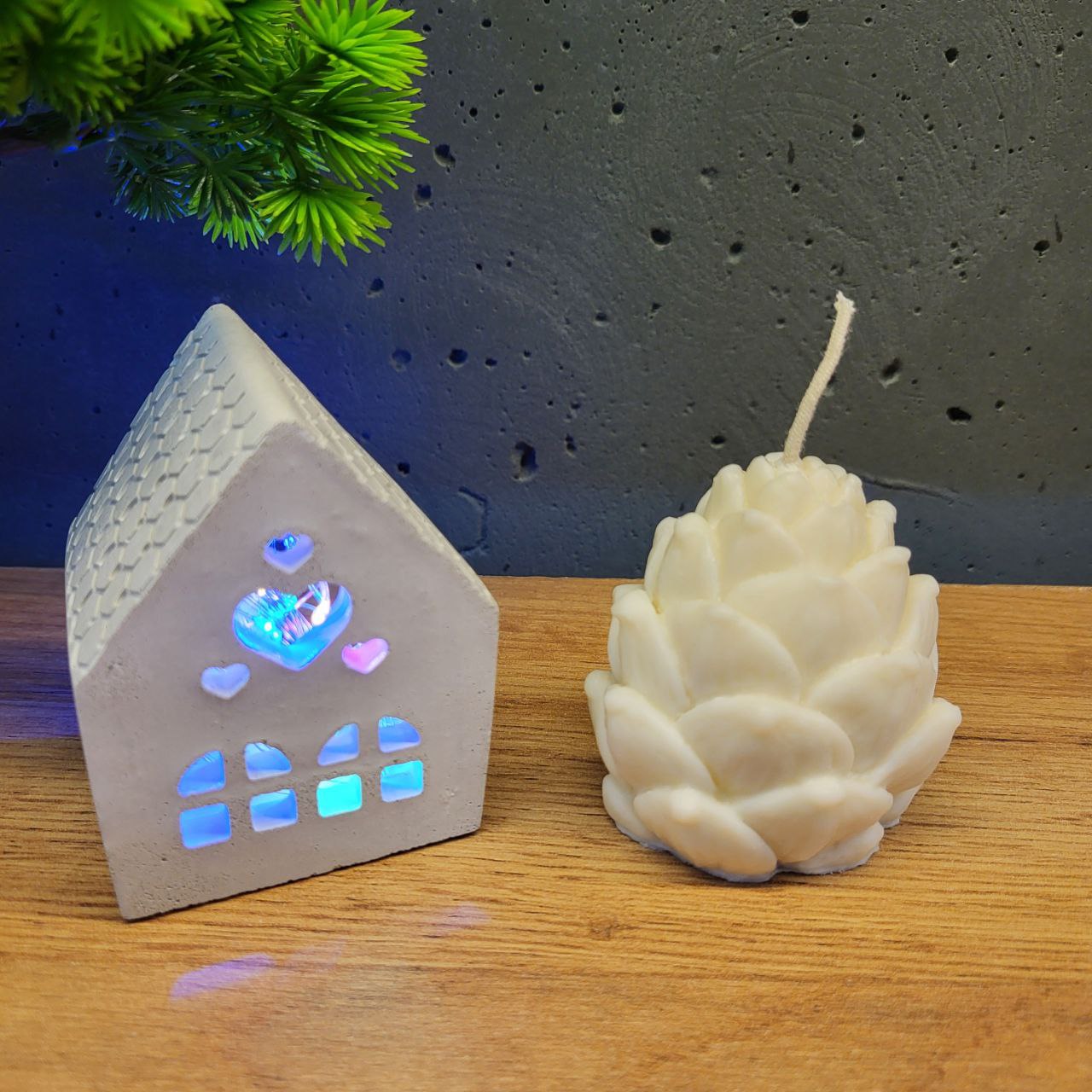 подарунковий набір: виріб з бетону та свічка шишка. Білий набір з 2 предметів: свічка-шишка декоративна, будиночок декоративний. Всі вироби ручної роботи. Набір запаковано в подарункову коробку з наповненням, та святковою стрічкою. Ви отримаєте вже готовий подарунок без зайвої біганини по крамницях