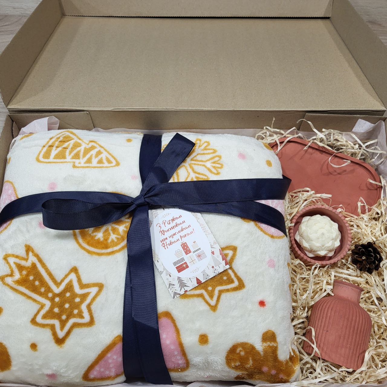 Елегантний подарунковий набір, що поєднує м’який текстиль і стильні підсвічники. Ідеальний варіант для затишного дому або святкового подарунку близьким. Створює теплу атмосферу комфорту й гармонії.