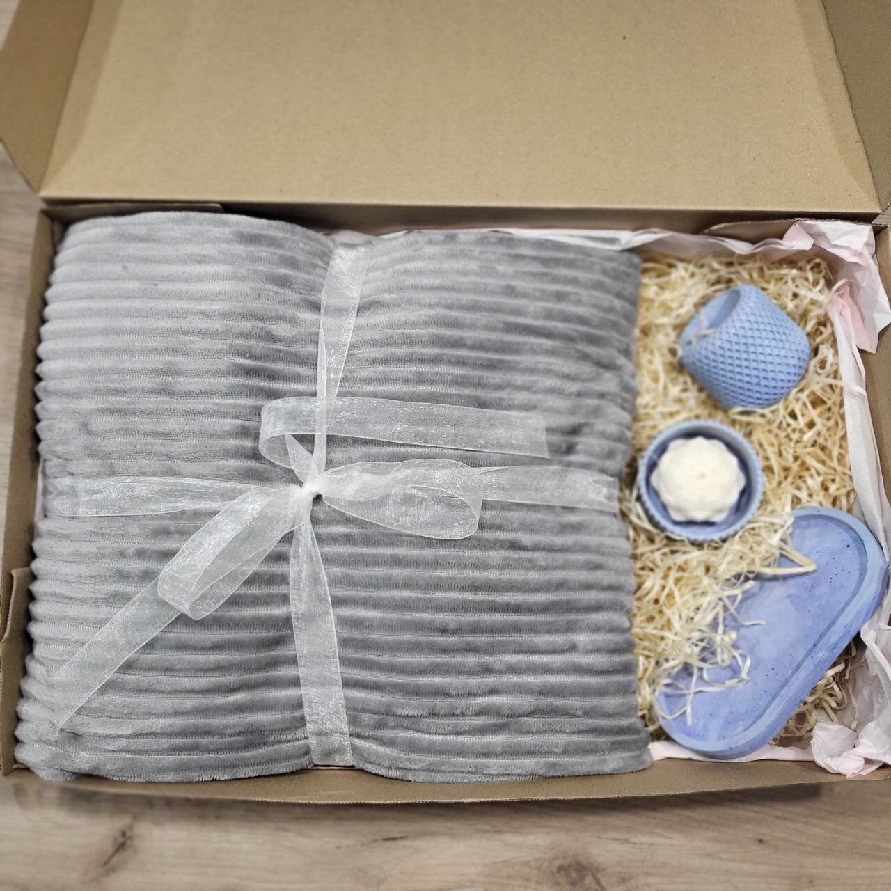 подарунковий набір: плед шарпей сірий та набір з бетону та ароматична свічка