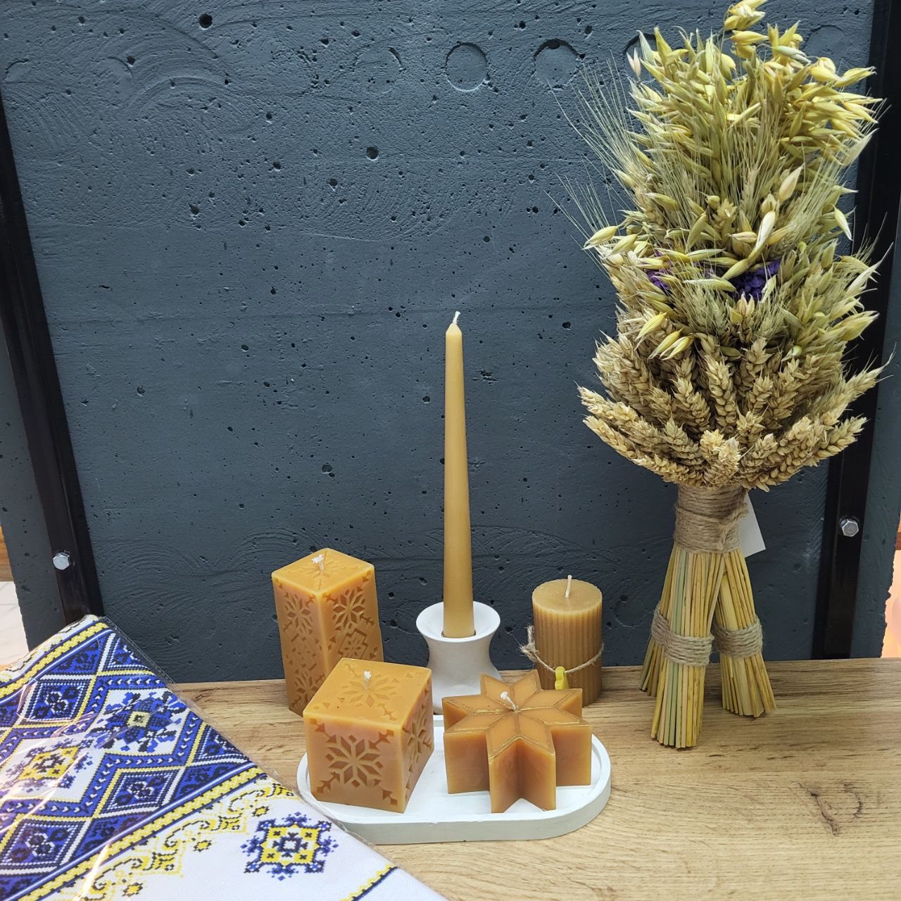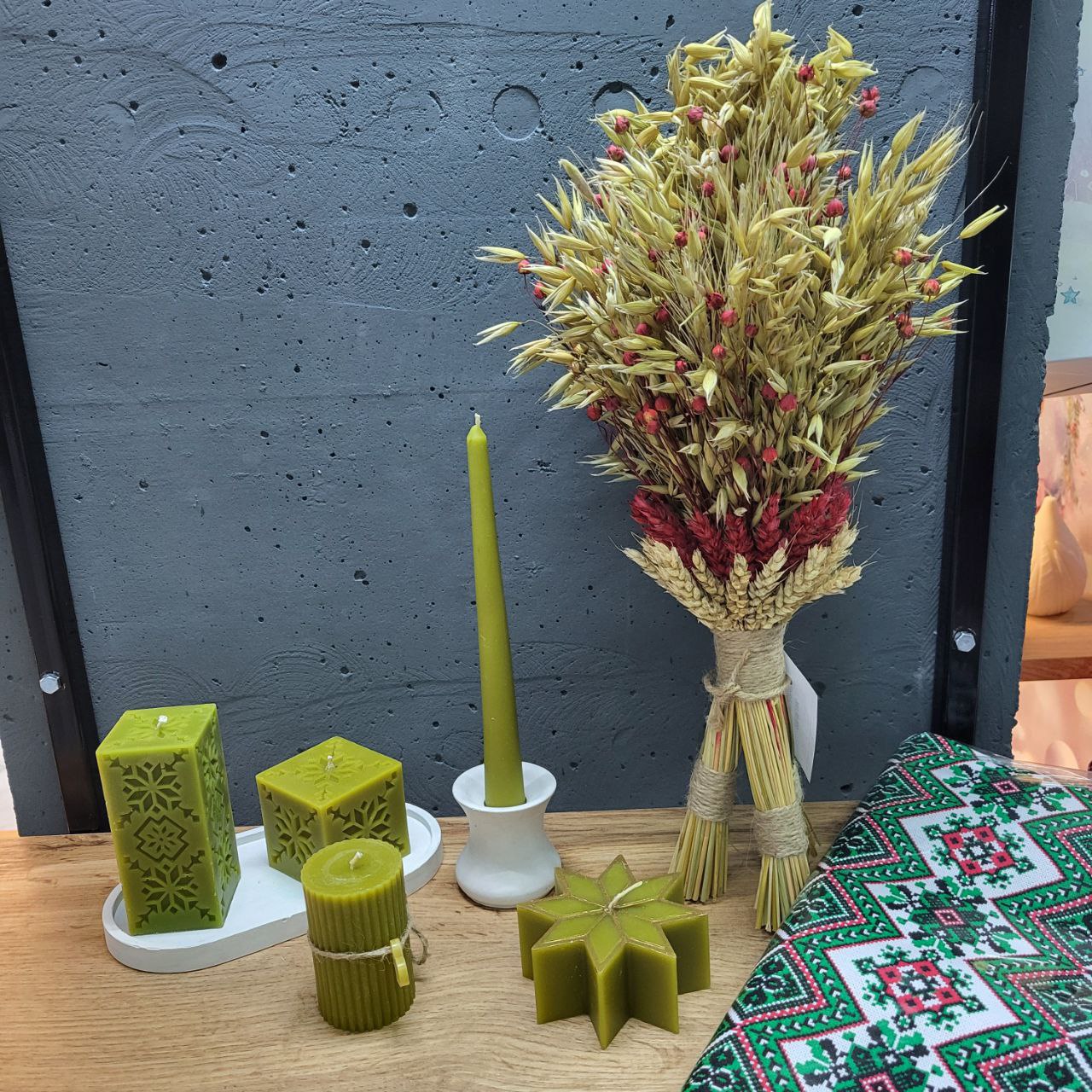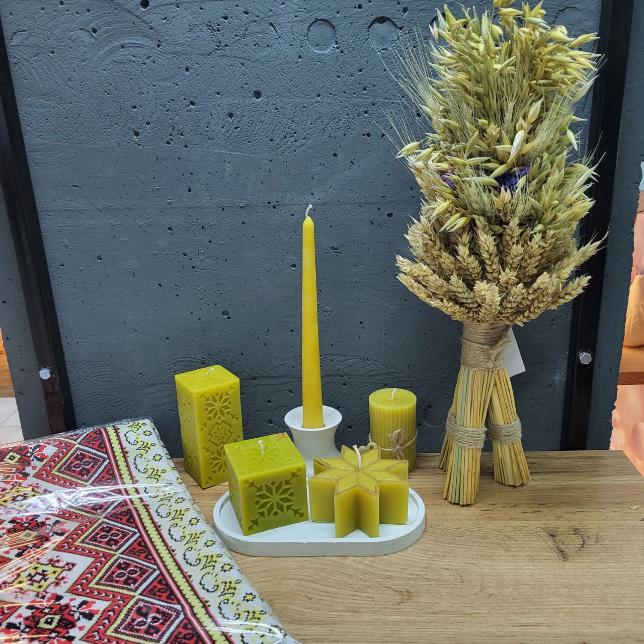 Скатертина: 110х150см. Дідух: Набір свічок, з підсвічником та підставкою з бетону – 7 предметів. Склад свічки: бджолиний віск. До набору входить: підсвічник з бетону, підставка з бетону, свічки. Кольори свічко: жовтий, зелений, темно-помаранчевий