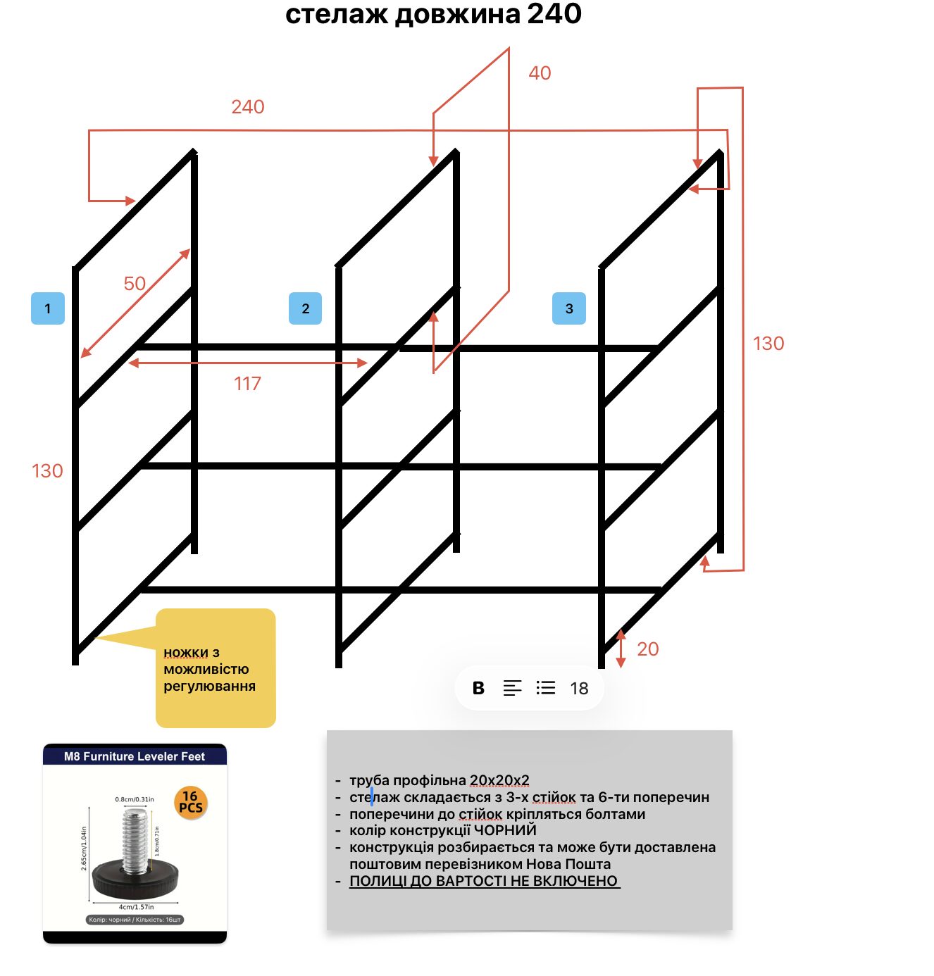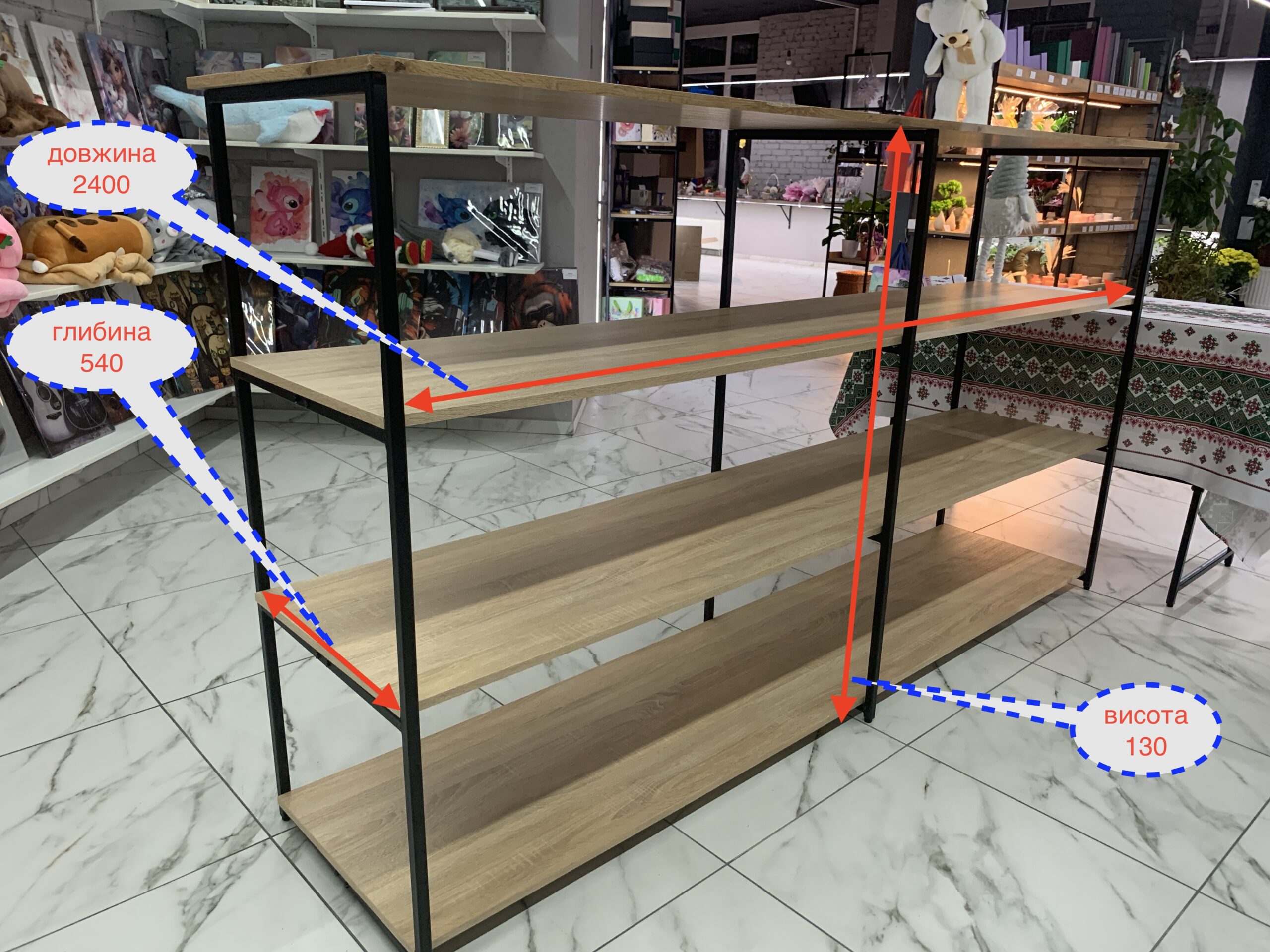 Конструкції для стелажа 2400х1300х540. Конструкція з профільної труби 20х20см. Конструкція складається з 3х основних та 6 зʼєднувальних металевих деталей. В зібраному стані конструкція витримує значні вагові навантаження та є стійкою. Колір: чорний глянець. Полиці у вартість не входять. Виготовляємо конструкції з металу за вашими розмірами та характеристиками. Можливе виготовлення стелажа з полицями та підсвіткою полиць. Для замовлення відправте характеристики tefitiflowers5@gmail.com