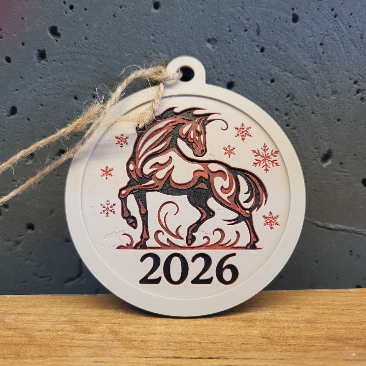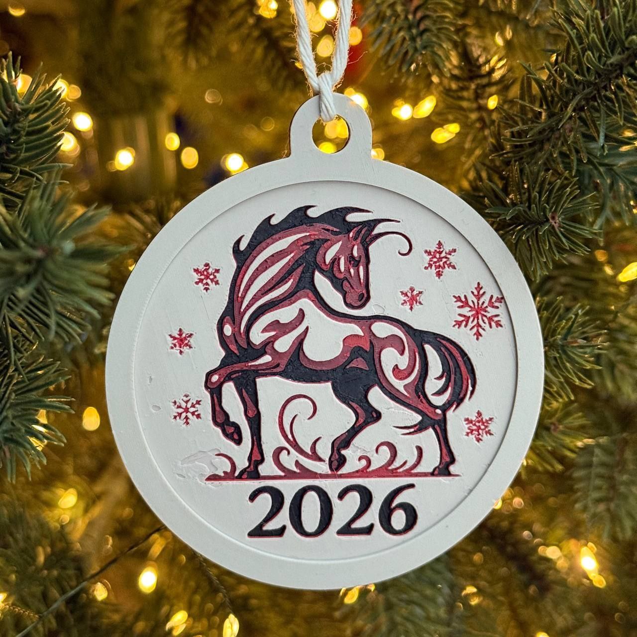 Іграшка на ялинку Вогняний кінь. Святкова прикраса з символом року. Стильний акцент для ялинки, який додає настрою й добре виглядає як пам’ятний декор або невеликий подарунок. Діаметр 8см.